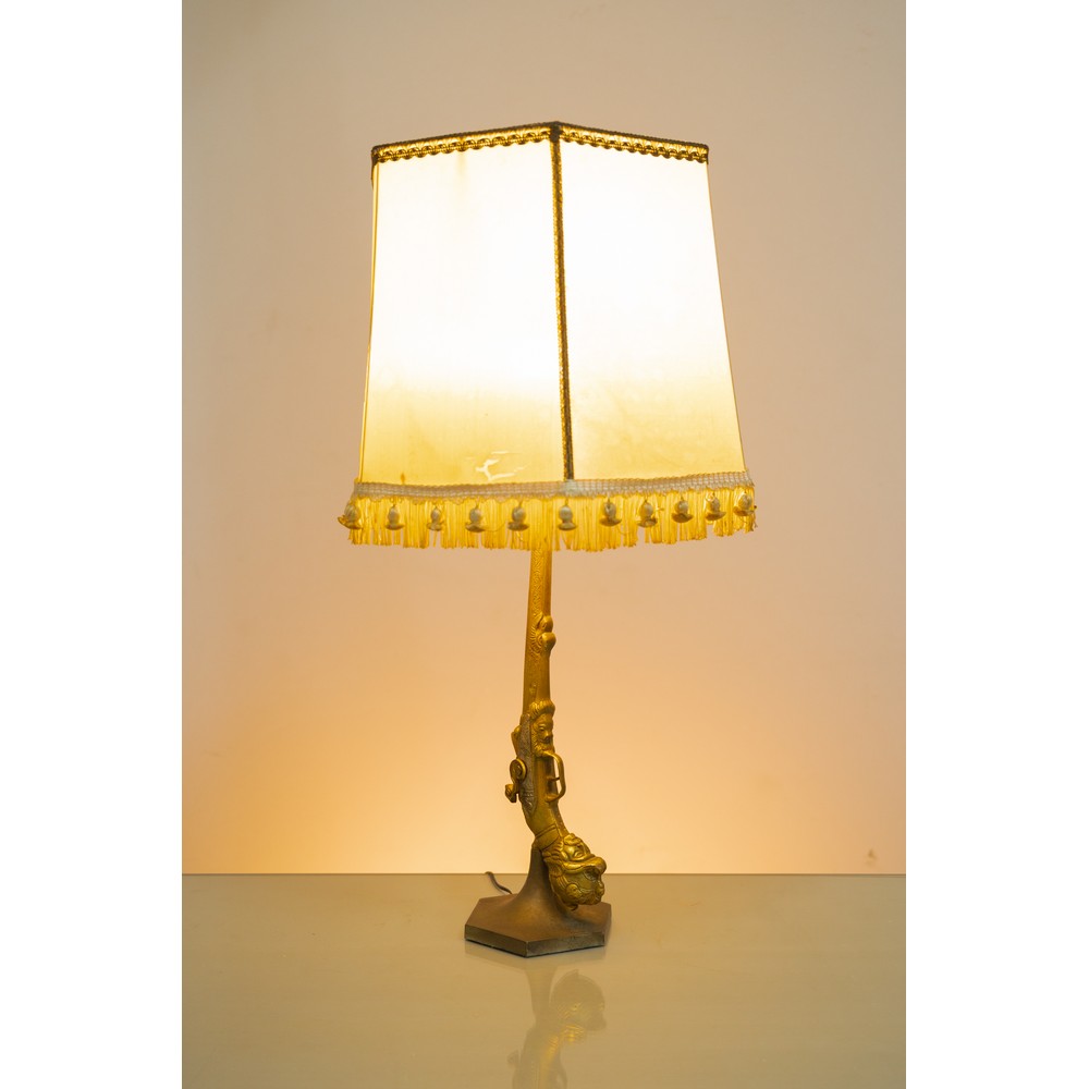 TABLE LAMP WITH ONE LIGHT, GOLDEN METAL STRUCTURE REPRODUCING A GUN, HEXAGONAL BASE, LAMPSHADE IN LIGHT FABRIC.