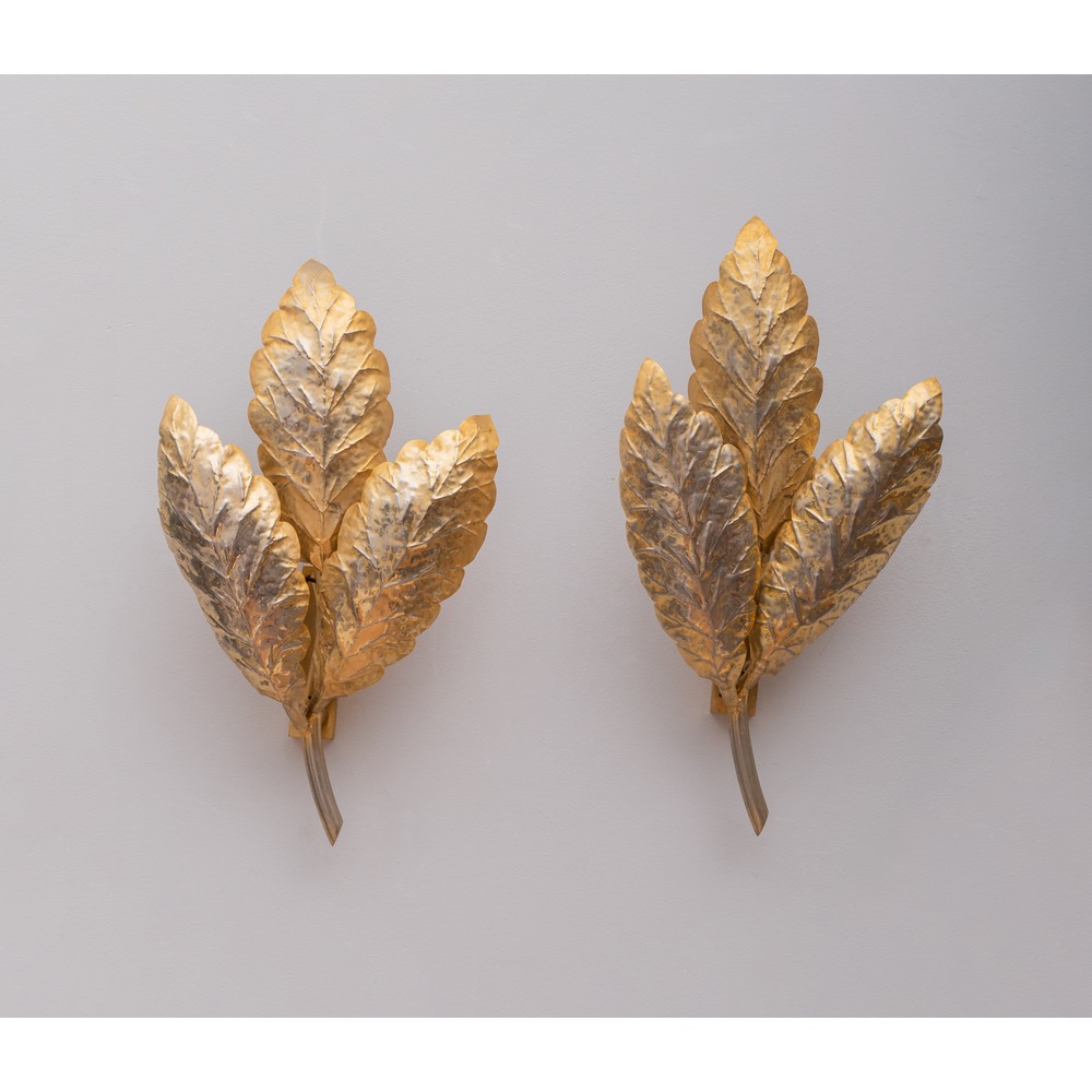 PAIR OF THREE-LEAF BRASS WALL LAMPS.