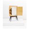 Mobile bar in legno e pergamena serigrafata da Silvio Testi, sul fronte una scena con strumenti musicali, anta battente, interno con vetri specchiati e illuminato. Etichetta di produzione Tura.