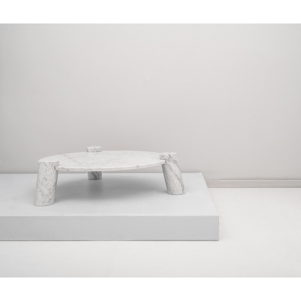 COFFE TABLE FROM THE EROS SERIES IN WHITE CARRARA MARBLE, BETWEEN CYLINDRICAL INCLINED FEET AND A CIRCULAR TOP.