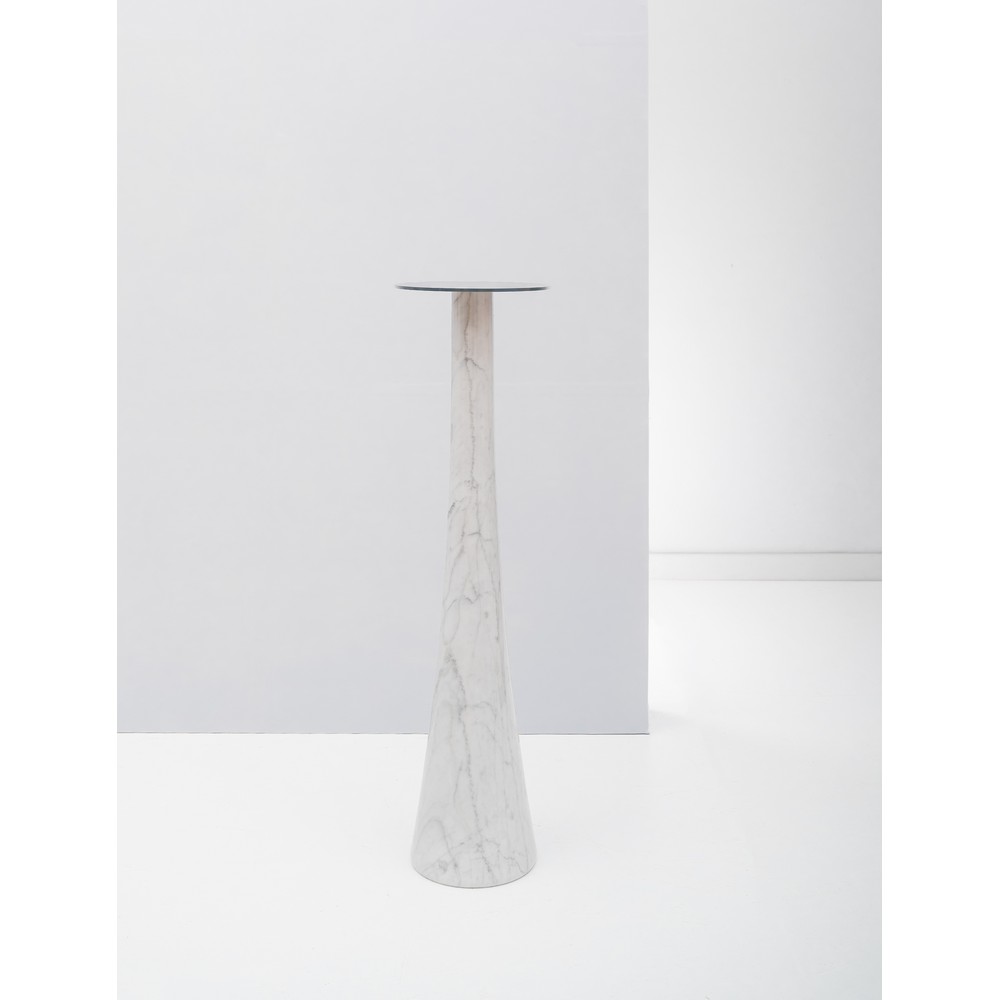 Colonna modello “Attesa” in marmo bianco di carrara, piano rotante circolare in metallo verniciato.