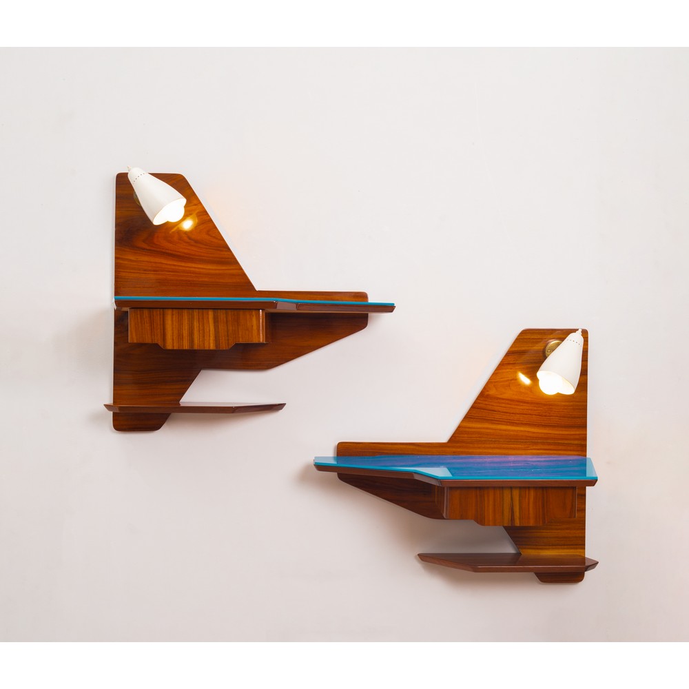 Coppia di comodini pensili in legno con venatura scura, due mensole, un piccolo cassetto, piano in vetrolite blu, diffusore luminoso orientabile ad una luce in alluminio verniciato bianco.
