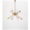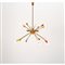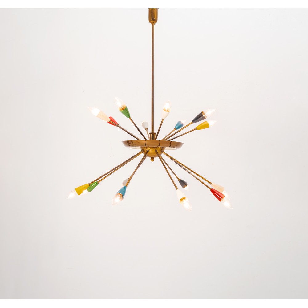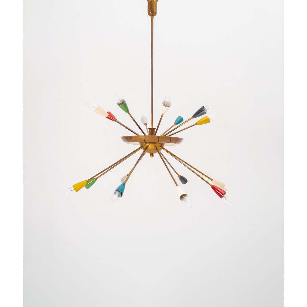 Lampada a sospensione modello “Sputnik” a sedici luci in ottone, disco centrale circolare, diffusori conici in alluminio laccato. Etichetta Stilnovo danneggiata.