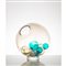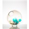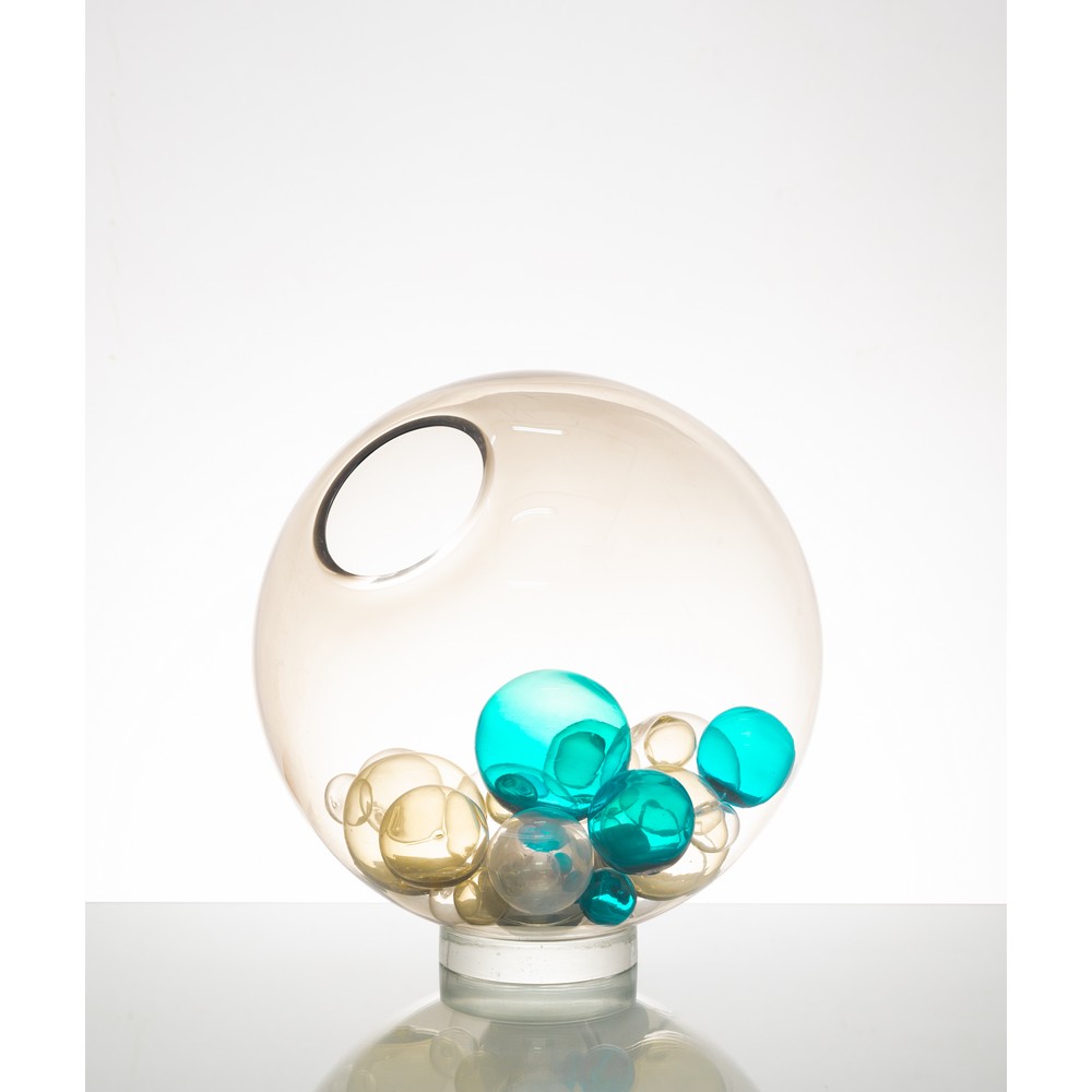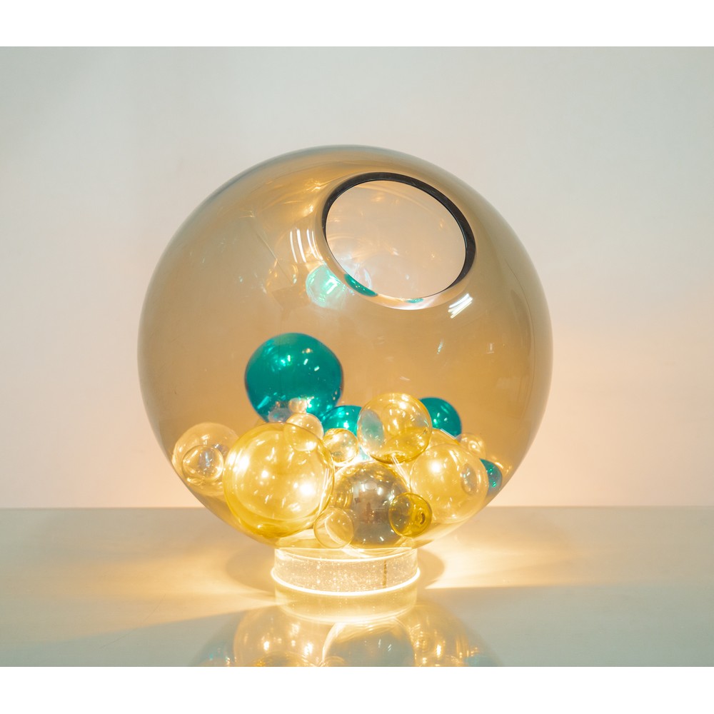 TABLE LAMP WITH ONE LIGHT, SPHERICAL DIFFUSER IN TRANSPARENT GLASS WITH BLUE, TRANSPARENT AND SMOKED BLOWN GLASS SPHERES.