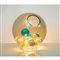Lampada da tavolo ad una luce, diffusore sferico in vetro trasparente con sfere in vetro soffiato azzurre, trasparenti e fumè.