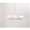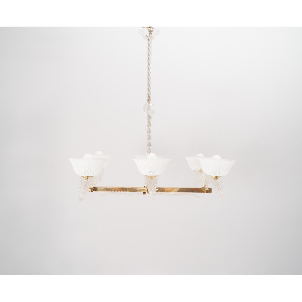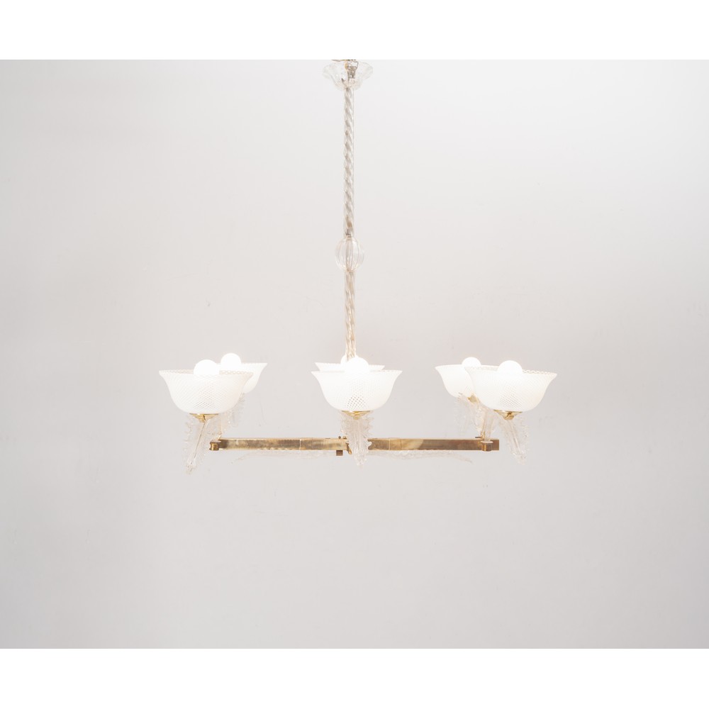 Grande lampada a sospensione a sei luci modello “Gondola”, struttura in ottone lucido, diffusori a coppa in vetro soffiato a reticello, foglie ricurve in vetro incolore, stelo in vetro incolore.