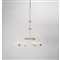 Lampada a sospensione a sei luci in vetro trasparente ed ottone, diffusori semisferici in vetro a reticello. Elementi di decoro a ricciolo su tre piani.
