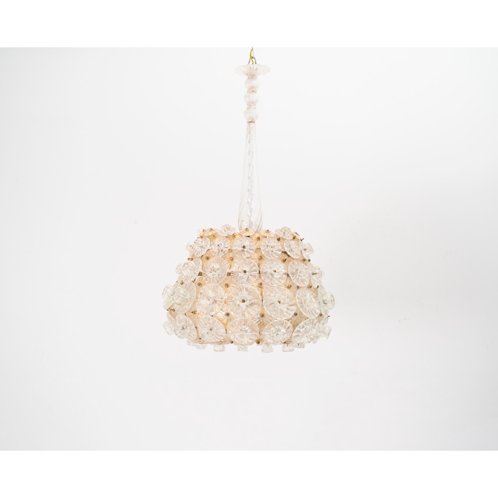 SUSPENSION LAMP WITH SIX LIGHTS IN BLOWN GLASS, OVAL LIGHT DIFFUSER DECORATED WITH FLOWERS IN TRANSPARENT AND COLORED GLASS WORKED IN THE HEAT.