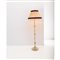 Lampada da terra in vetro trasparente, struttura in ottone, composta da elementi conici e da anelli in ottone, paralume in tessuto.