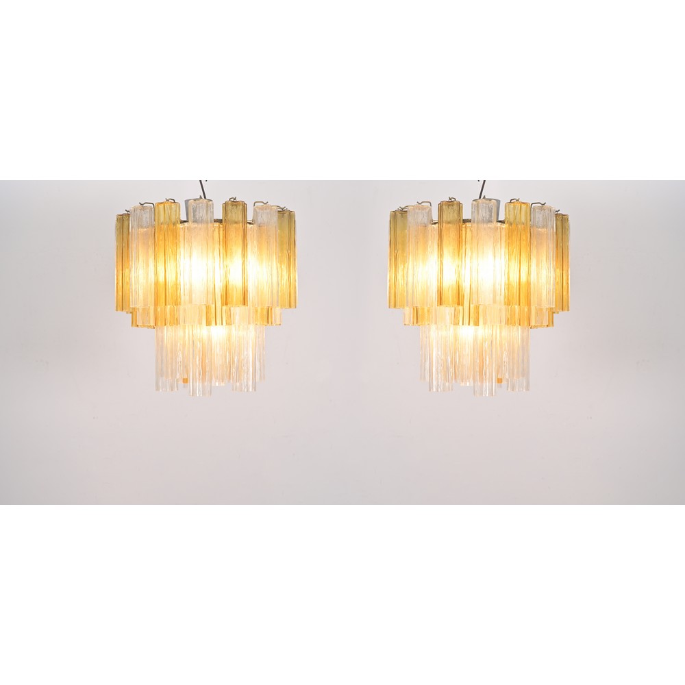 PAIR OF SUSPENDED LAMPS, CYLINDRICAL BODY WITH METAL STRUCTURE, “TRUNKS” ELEMENTS IN TRANSPARENT AND AMBER GLASS.