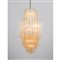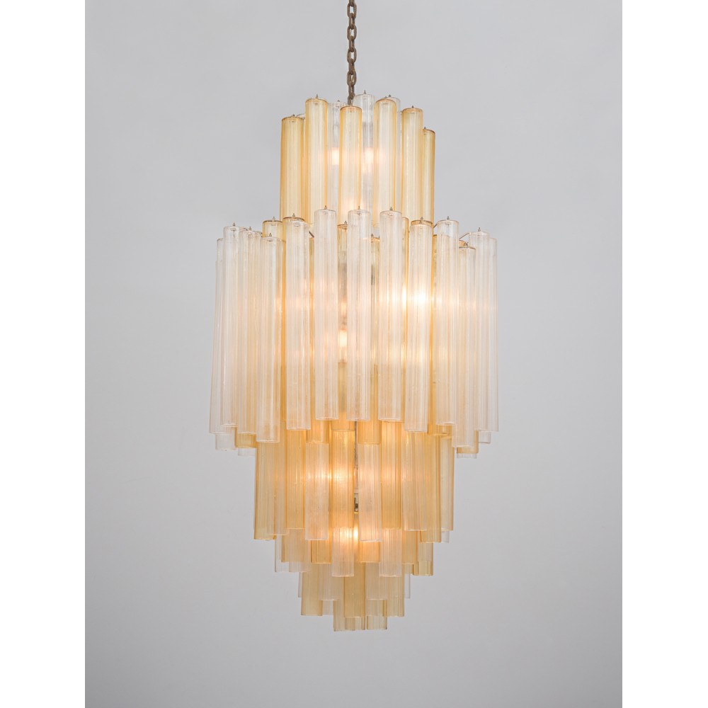 Imponente lampada da soffitto a ventinove luci, struttura in metallo, lunghi elementi modulari a “Calza” in vetro soffiato nei toni trasparente opaco e paglierino, corpo cilindrico a cascata (piccole usure).