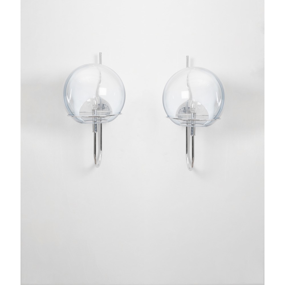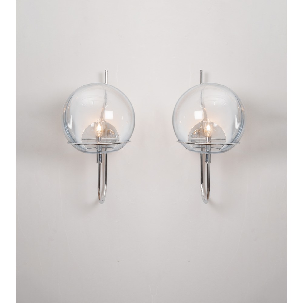 PAIR OF ONE-LIGHT “MEMBRANE” MODEL WALL LAMPS, CHROMED METAL STRUCTURE, CIRCULAR DIFFUSERS IN BLUED GLASS WITH LATTTIMA MEMBRANE.
