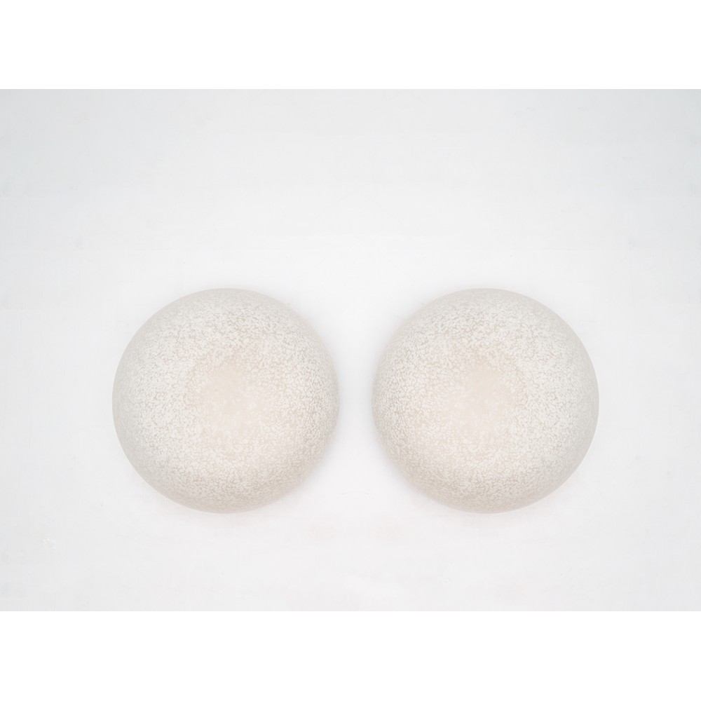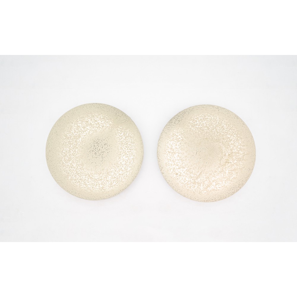 Coppia di lampade parete-soffitto, in vetro a trasparente e a macula lattimo, corpo circolare.