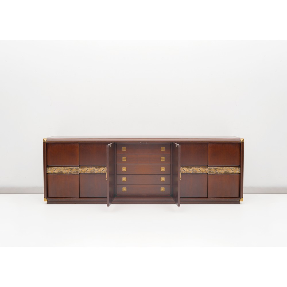 “DESIREE” MODEL SIDEBOARD, STRUCTURE IN MACASSAR EBONY WOOD WITH INSERTS IN CHISELED BRONZE CASTING, THREE COMPARTMENTS WITH HINGED DOORS AND CENTRAL CHEST OF DRAWERS.