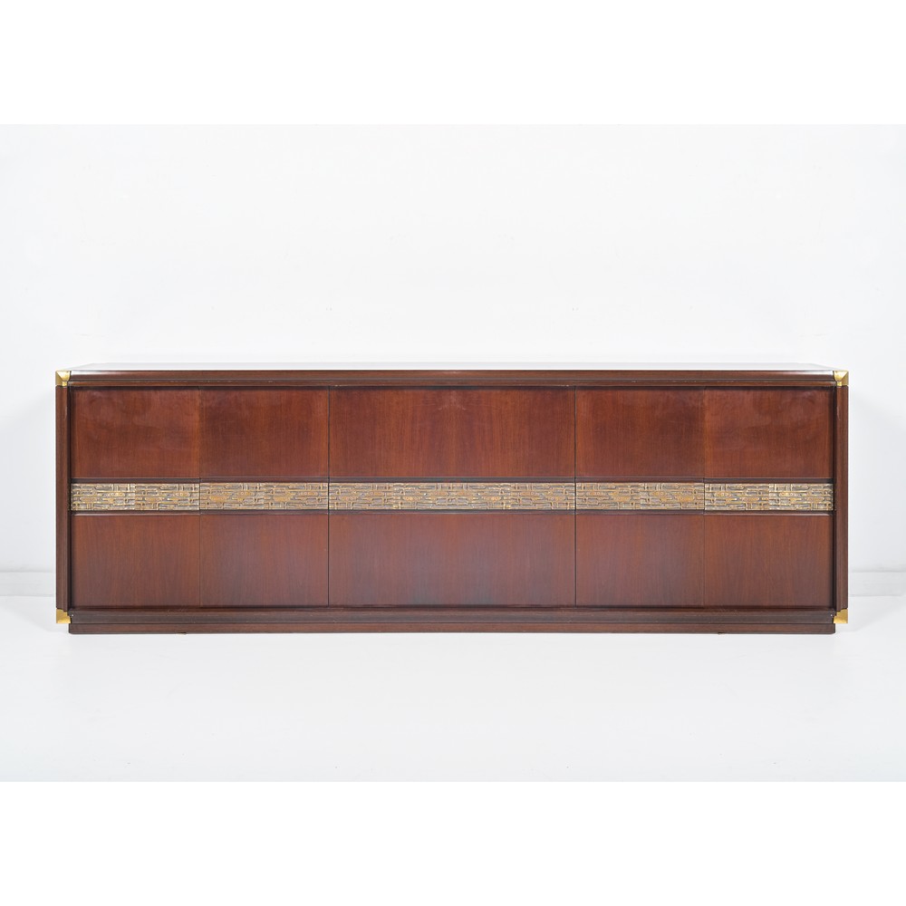 Sideboard modello “Desiree”, struttura in legno di Ebano Macassar con inserti in fusione di bronzo cesellato, tre vani ad ante battenti con cassettiera centrale.