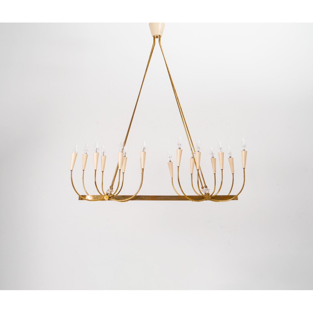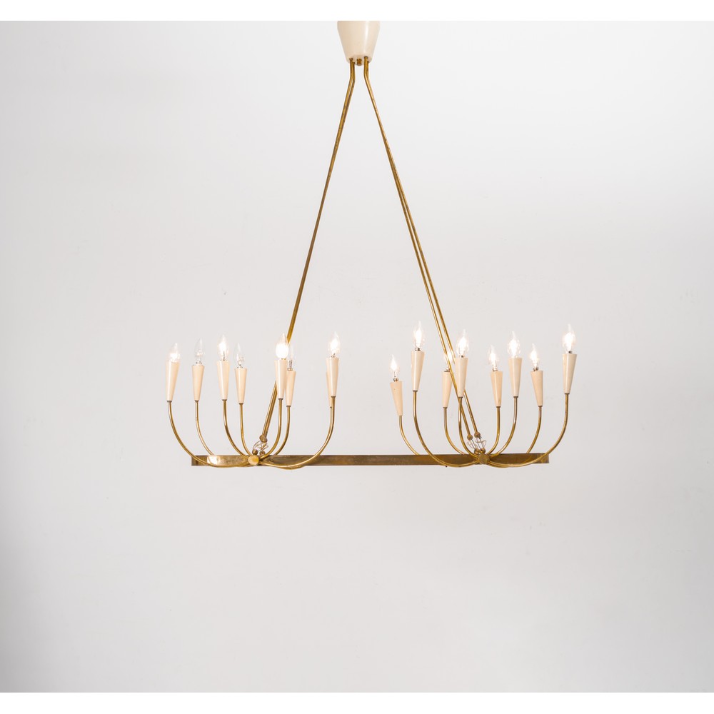 Grande lampada a sospensione a gondola in ottone, sedici luci, diffusori in alluminio verniciato avorio.
