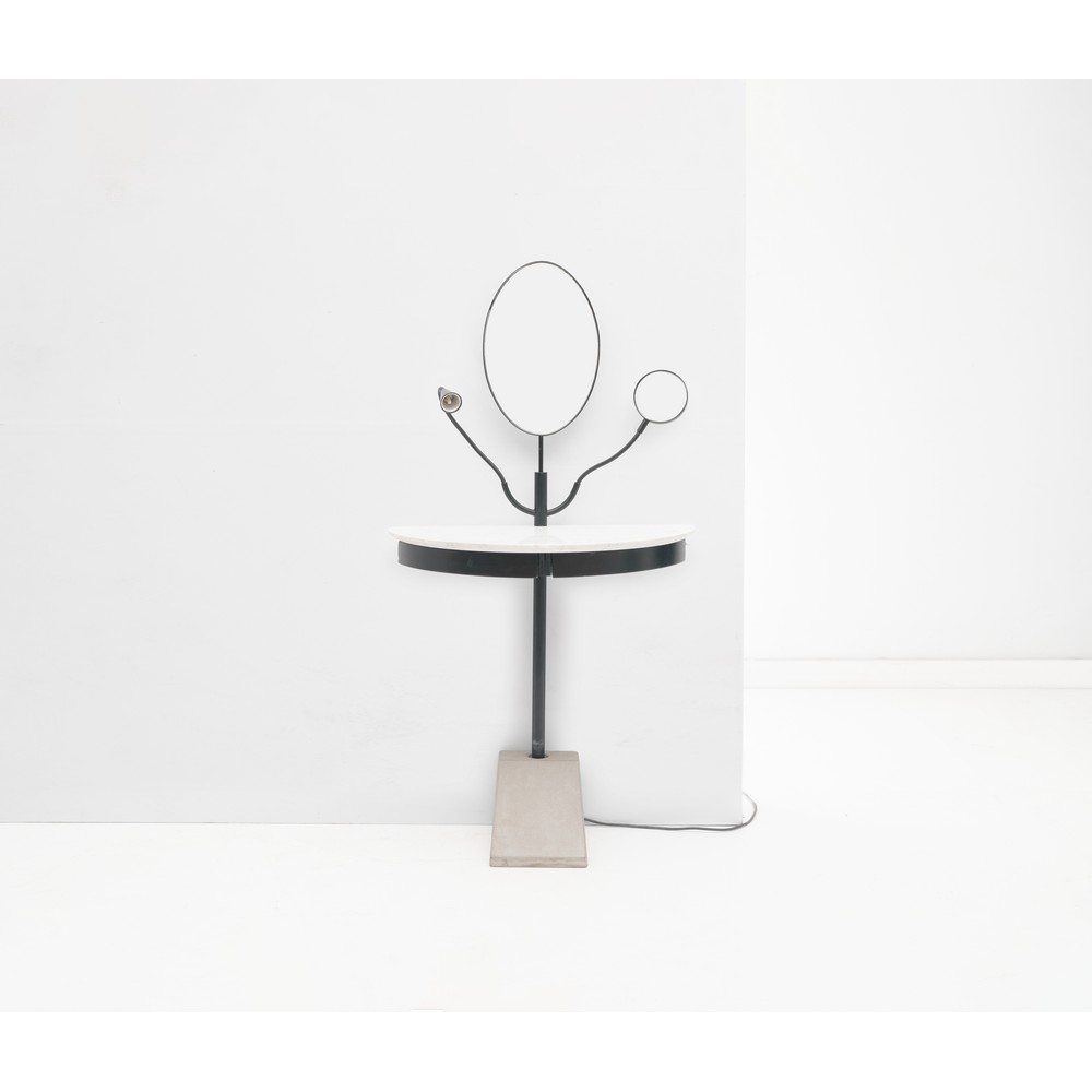 Tavolo polifunzionale, struttura in tubolare metallico verniciato nero, due specchi direzionabili, illuminazione, piano in marmo e due cassetti rotanti, base in cemento. Etichetta di produzione.