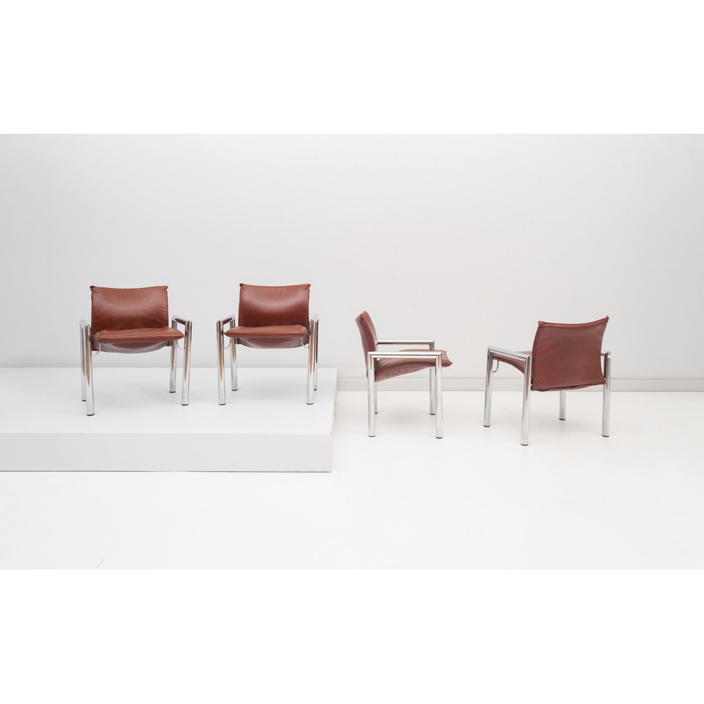 Quattro poltrone con struttura in acciaio tubolare cromato, seduta e spalliera in pelle marrone.