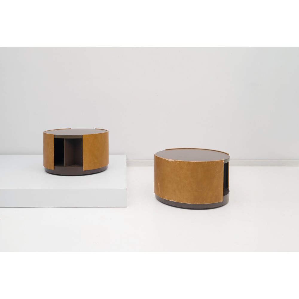 Coppia di tavoli bar modello “T-150”, corpo circolare con piano e vano portabottiglie girevole, rivestimento esterno in pelle cognac, legno laccato nero e metallo. Ruote. Etichetta di produzione.