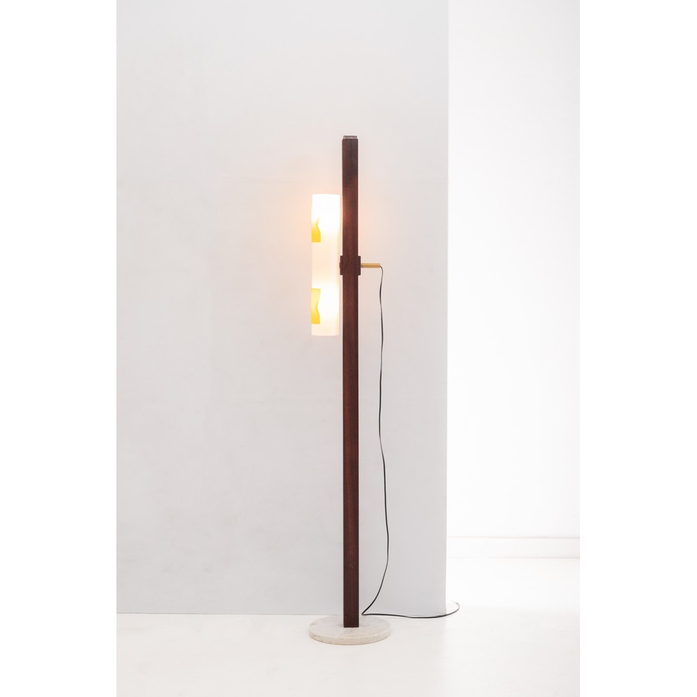 Lampada da terra scultura a due luci, struttura in legno con diffusore semicilindrico bianco orientabile in perspex con decoro in perspex giallo, base in marmo.
