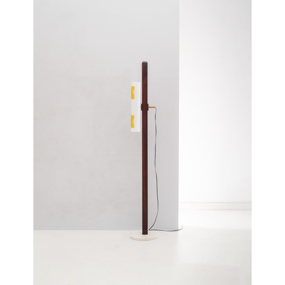 FLOOR LAMP SCULPTURE WITH TWO LIGHTS, WOODEN STRUCTURE WITH WHITE SEMI-CYLINDRICAL ADJUSTABLE PERSPEX DIFFUSER WITH YELLOW PERSPEX DECORATION, MARBLE BASE.