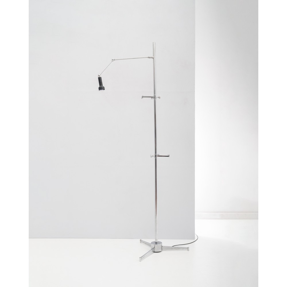 Lampada da terra ad una luce modello “12377” (“Cavalletto”), ottone, alluminio laccato.