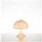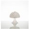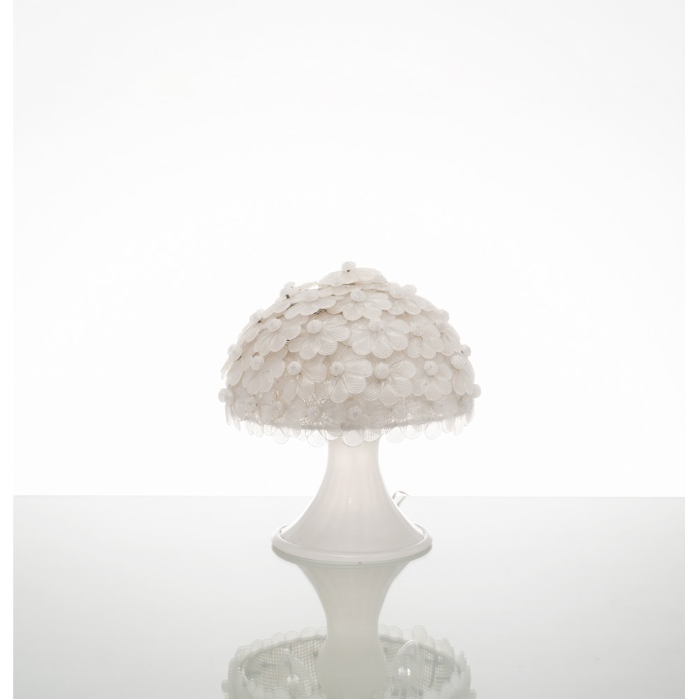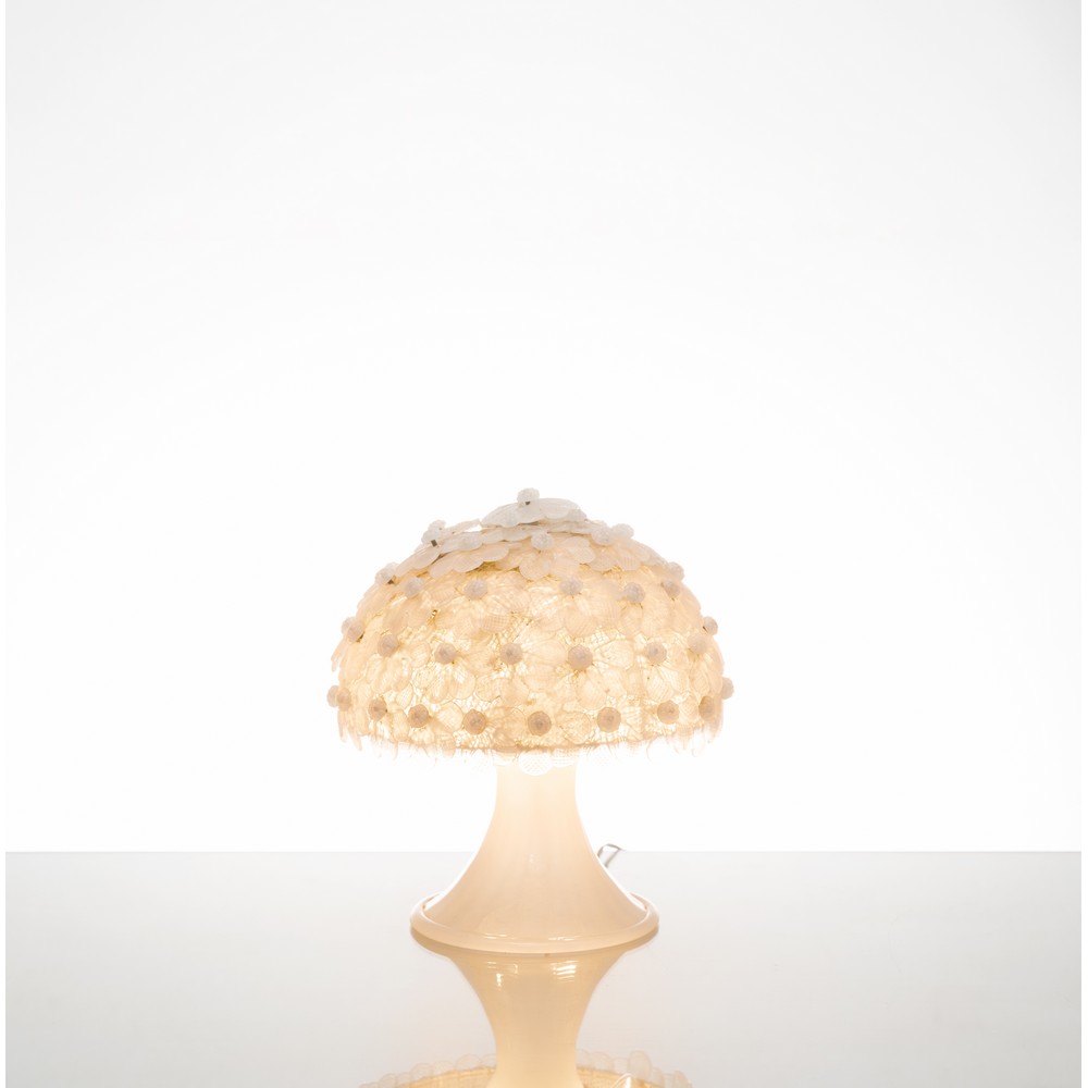 Lampada da tavolo a due luci, diffusore metallico semisferico con struttura in metallo verniciato bianco e rivestito con fiori in vetro lattimo, piede conico lattimo con base circolare.