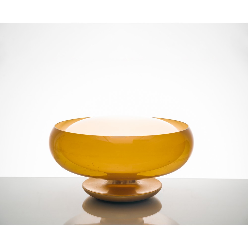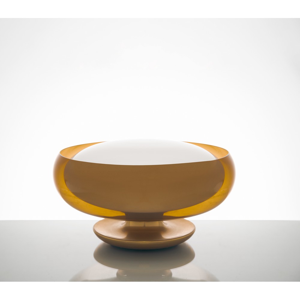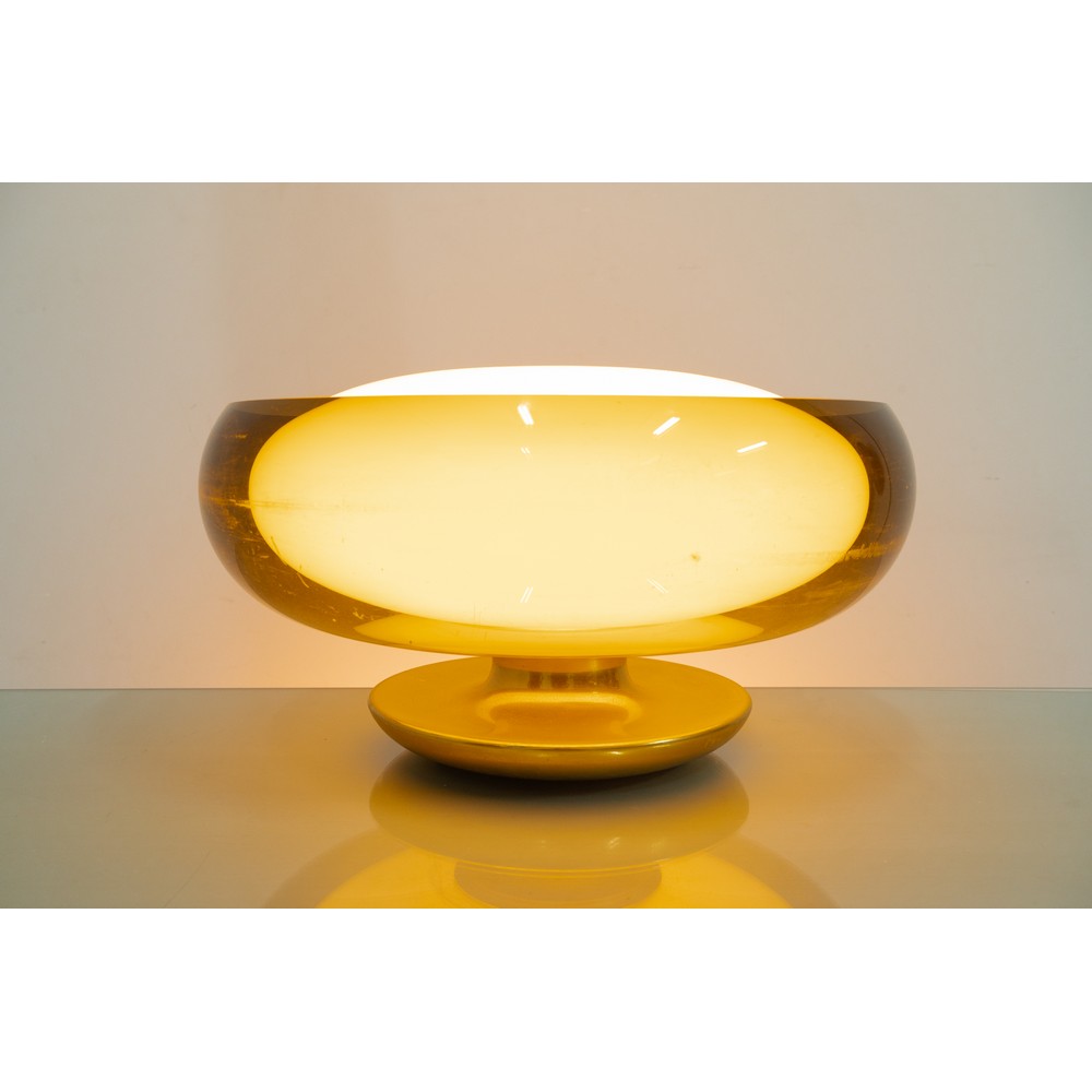 Lampada da tavolo ad una luce, diffusore sferico schiacciato in vetro opale, plexiglass e alluminio.
