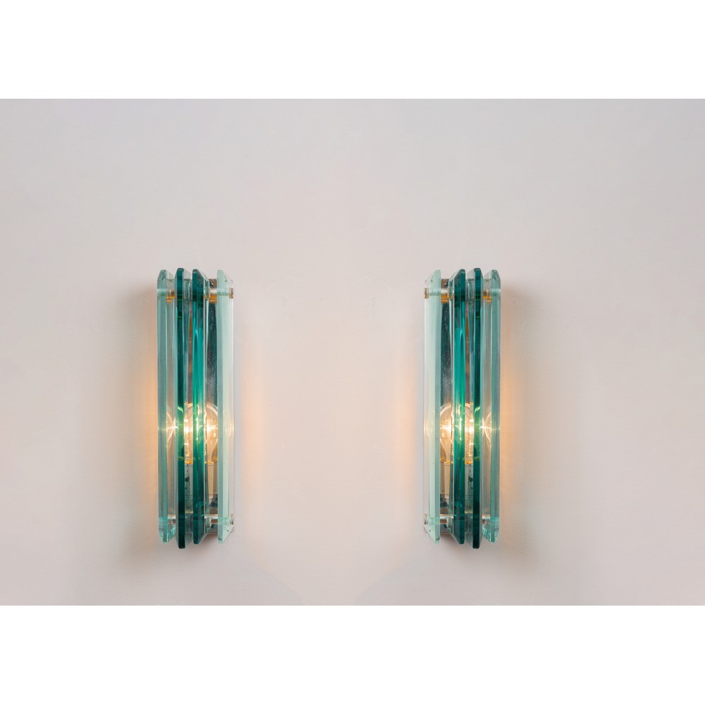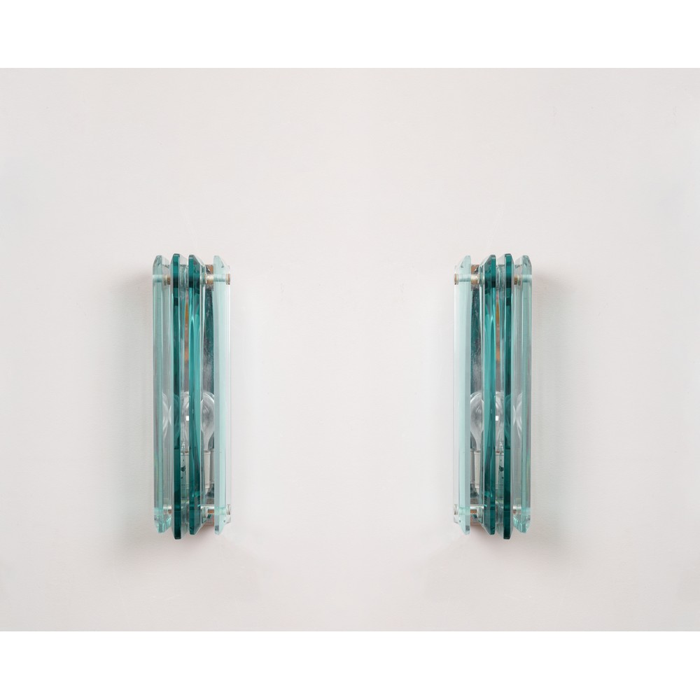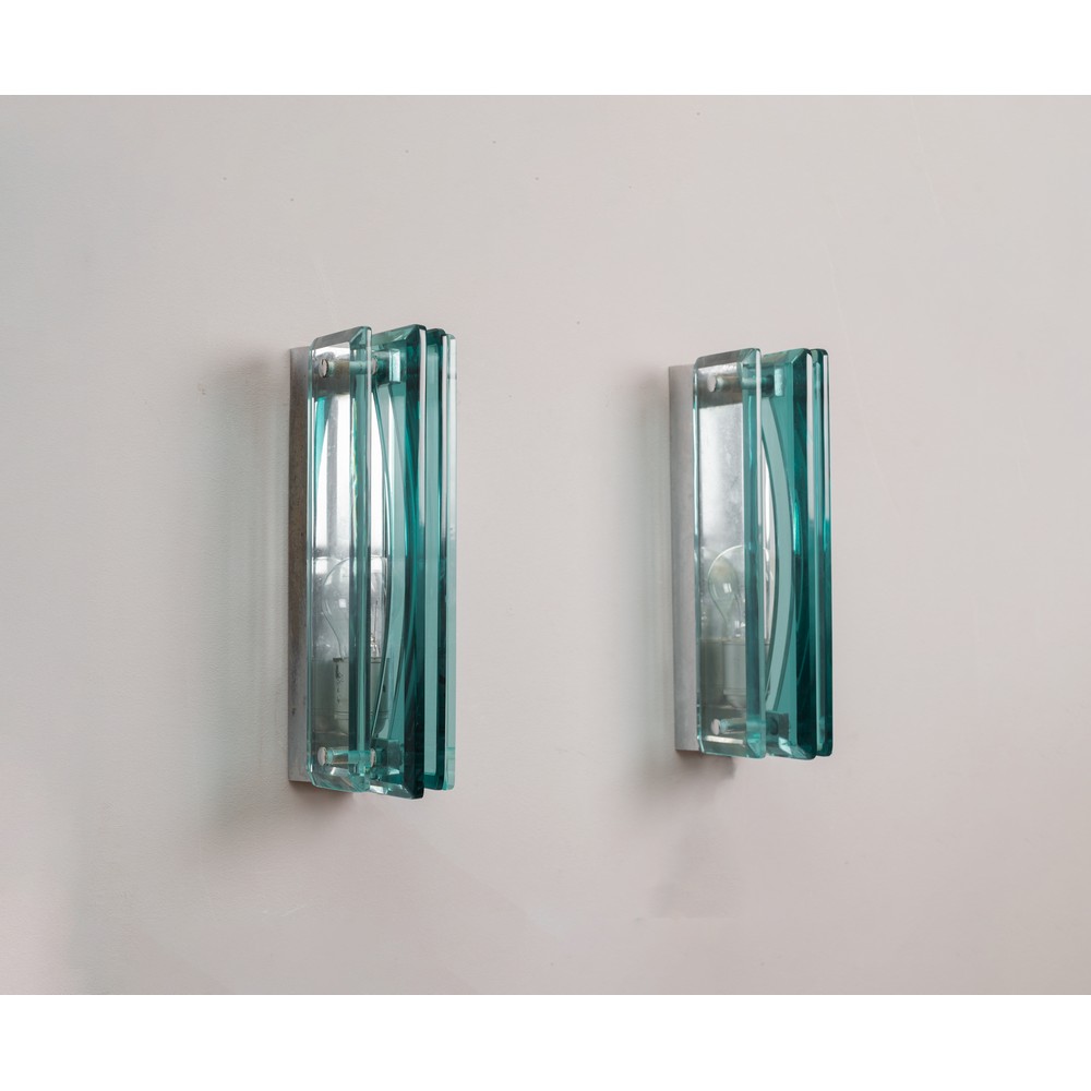Coppia di lampade da parete ad una luce in vetro di grosso spessore composte da quattro lastre parallele, struttura in metallo cromato.