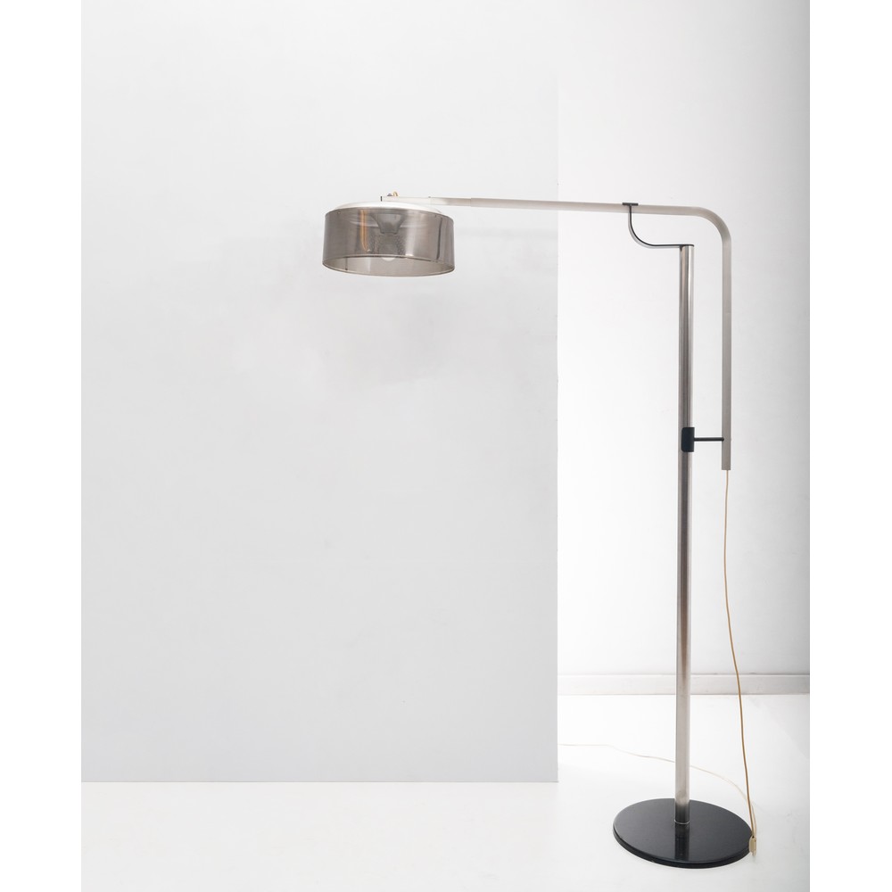 Lampada da terra ad una luce, struttura ad arco in metallo cromato, braccio estendibile, diffusore circolare in metallo microforato. Etichetta di origine.