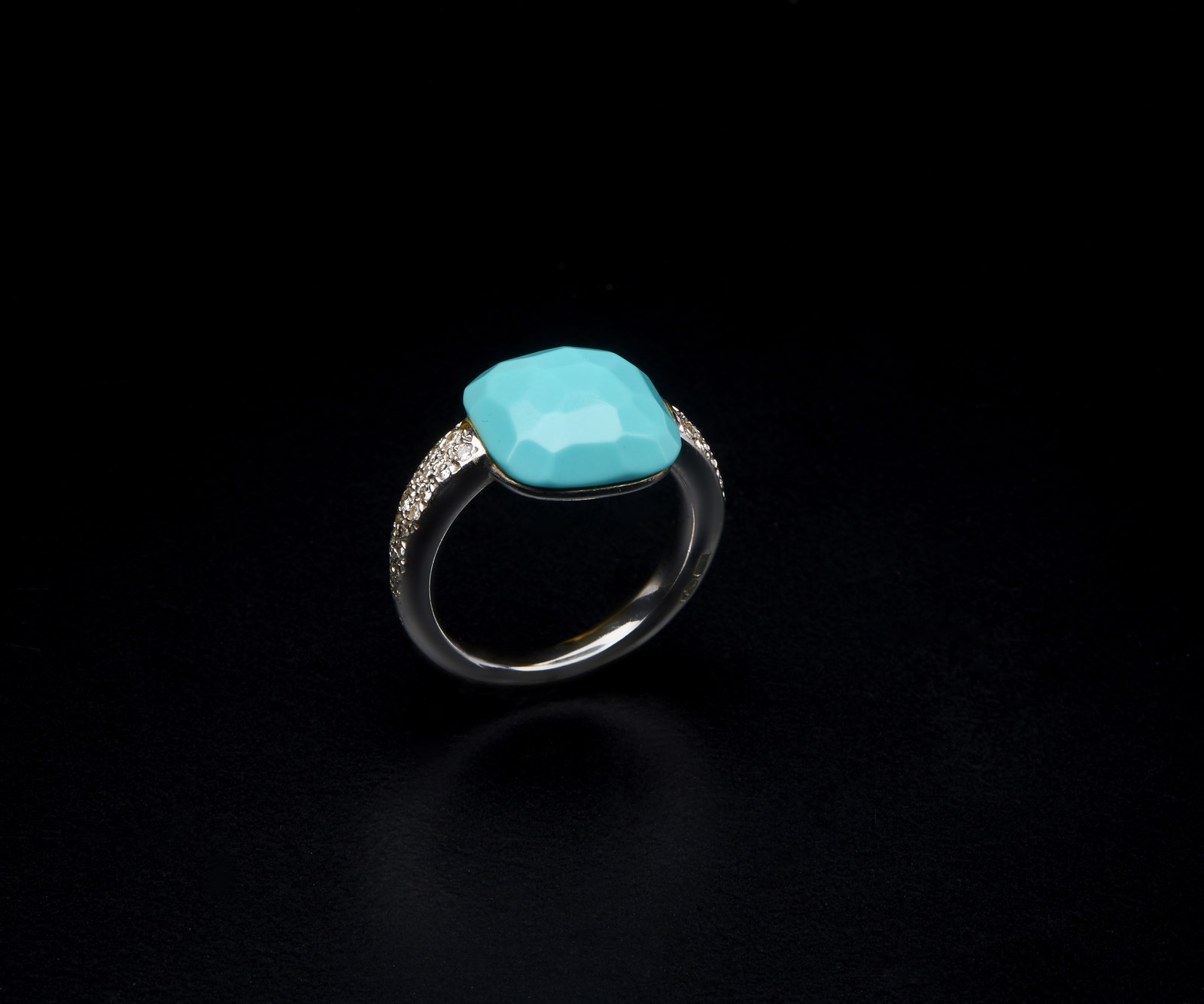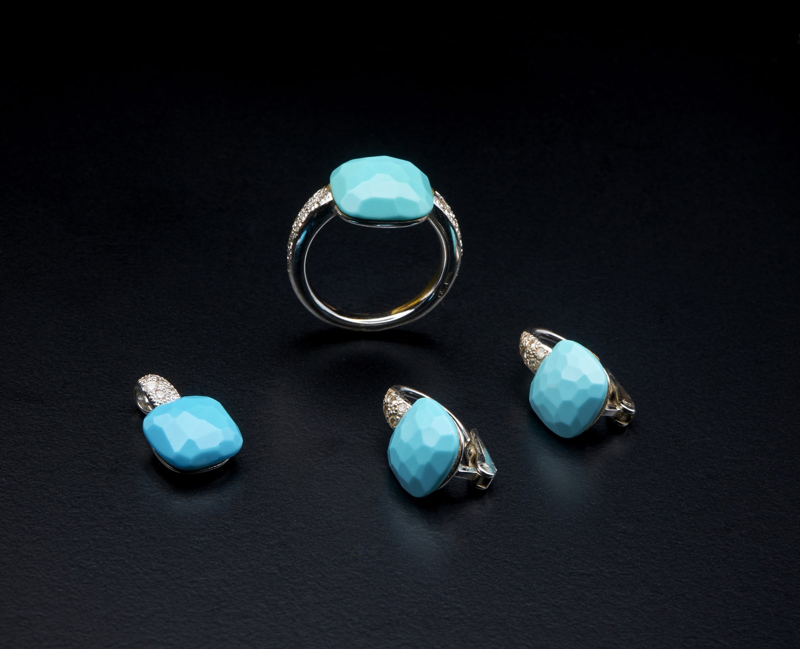 POMELLATO - Parure composta da anello,orecchini e ciondolo in oro bianco 750/1000 con diamanti taglio brillante ct. 0,40 circa e crisoprasi. Collezione "Capri". .