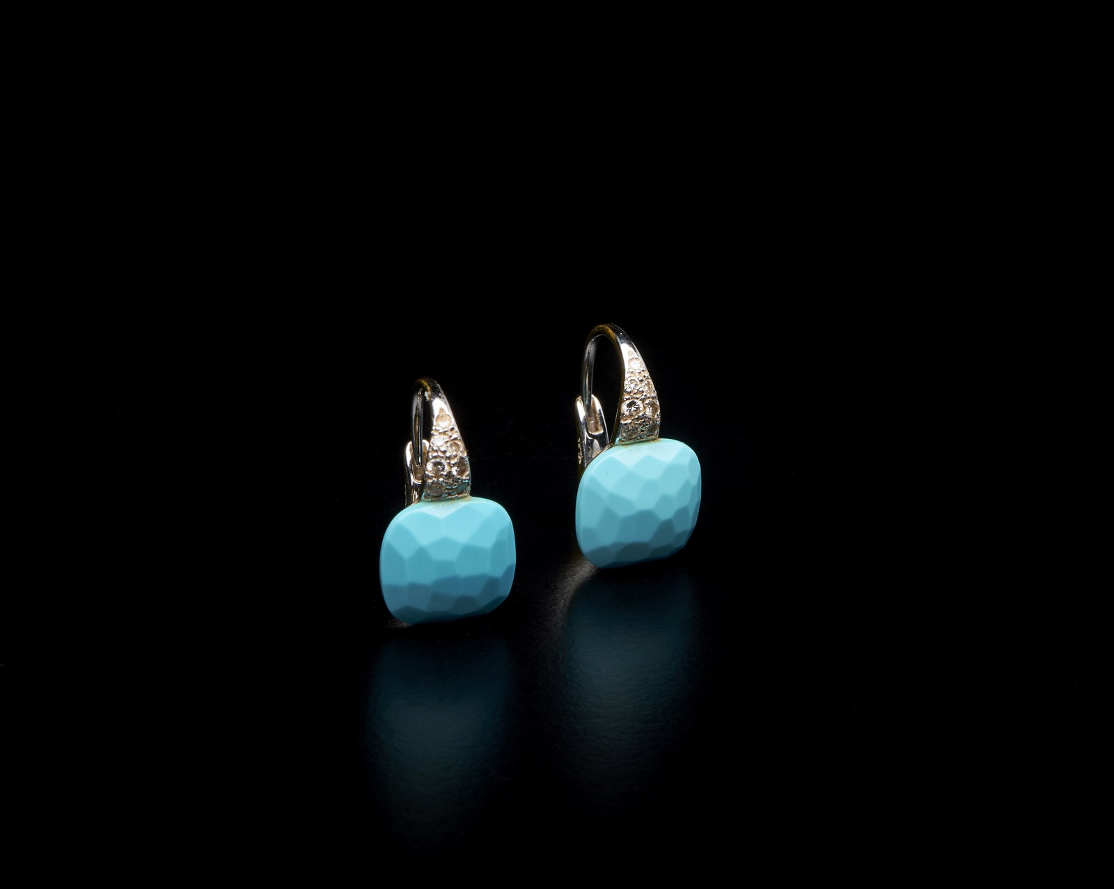 POMELLATO Parure composta da anello,orecchini e ciondolo in oro bianco 750/1000 con diamanti taglio brillante ct. 0,40 circa e crisoprasi. Collezione "Capri". . -. . Peso lordo 17,30 gr.