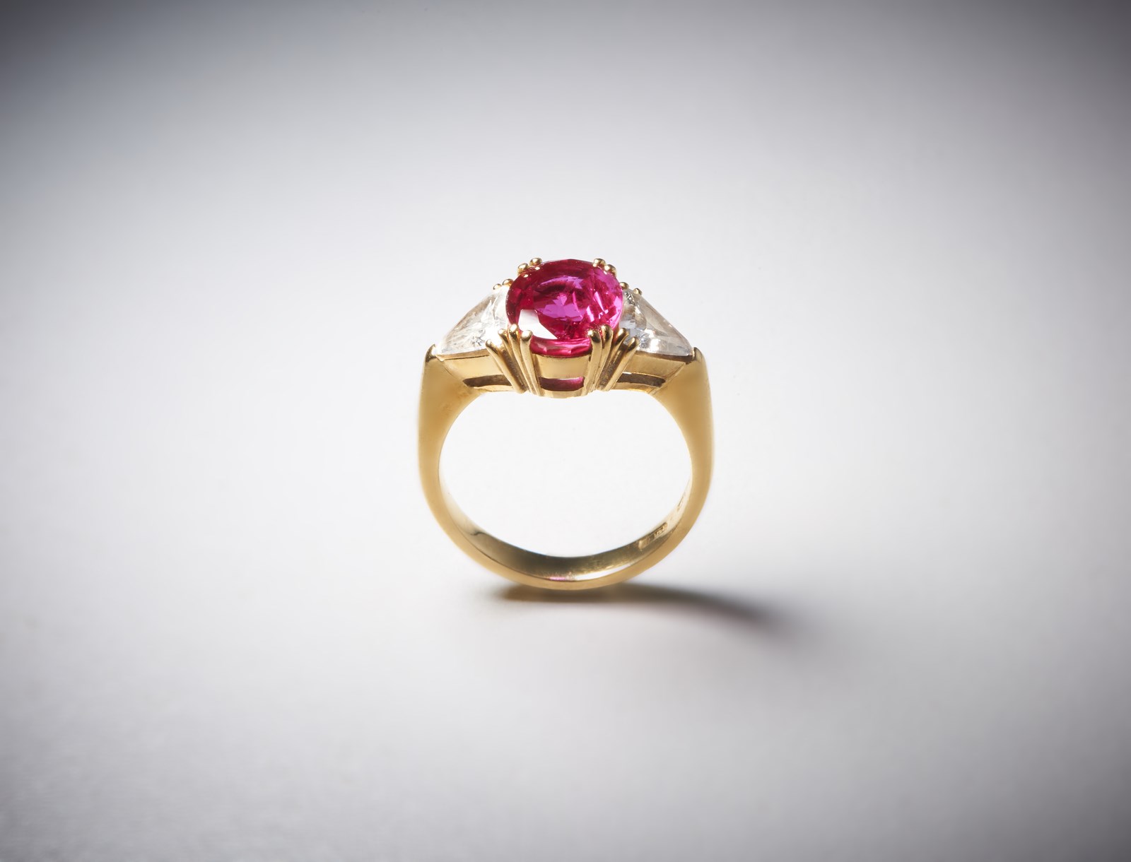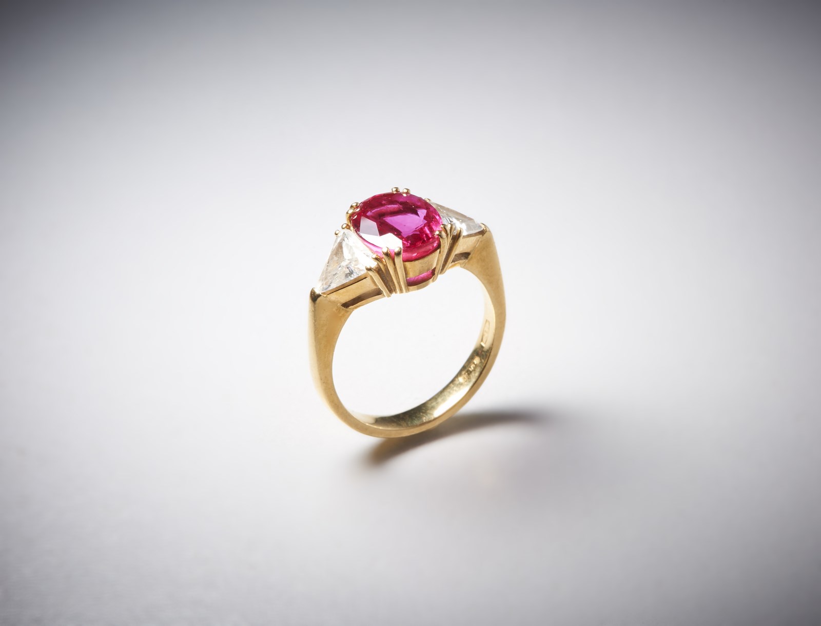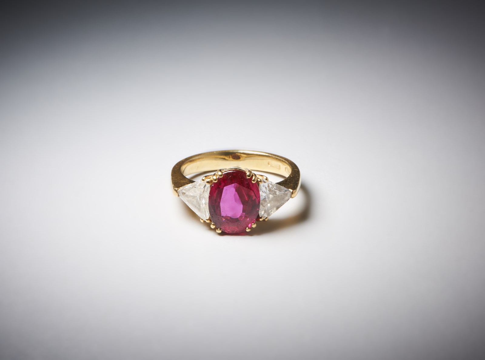 . Anello in oro giallo 750/1000 con rubino centrale di circa 3,00 carati e due diamanti triangolari. 1,50 carati circa. . . Eccezionale anello in oro giallo 750/1000 con rubino ovale di carati 3,00 circa, di colore rosso intenso e ben tagliato. Cristallo pulito e molto brillante. Peso lordo gr.6,00