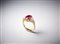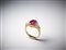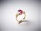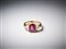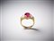 . - Anello in oro giallo 750/1000 con rubino centrale di circa 3,00 carati e due diamanti triangolari. 1,50 carati circa.