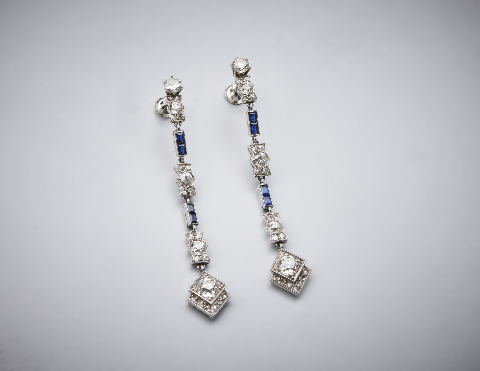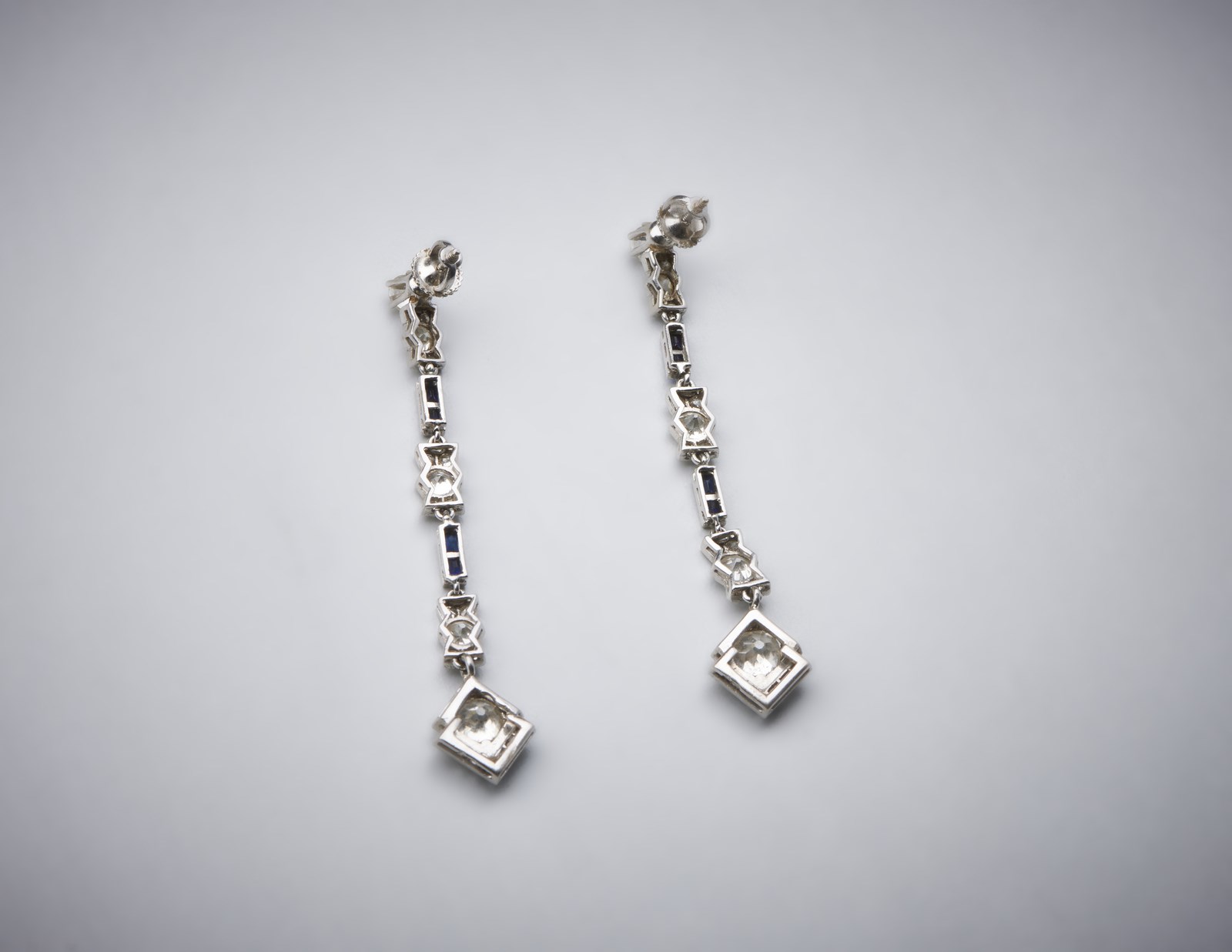 . Orecchini in oro bianco 750/1000 con diamanti taglio vecchio di circa 1,90 carati e diamanti taglio a brillante di circa 0,60 carati e zaffiri blu carrè. -. . Peso lordo 8,60 gr.