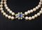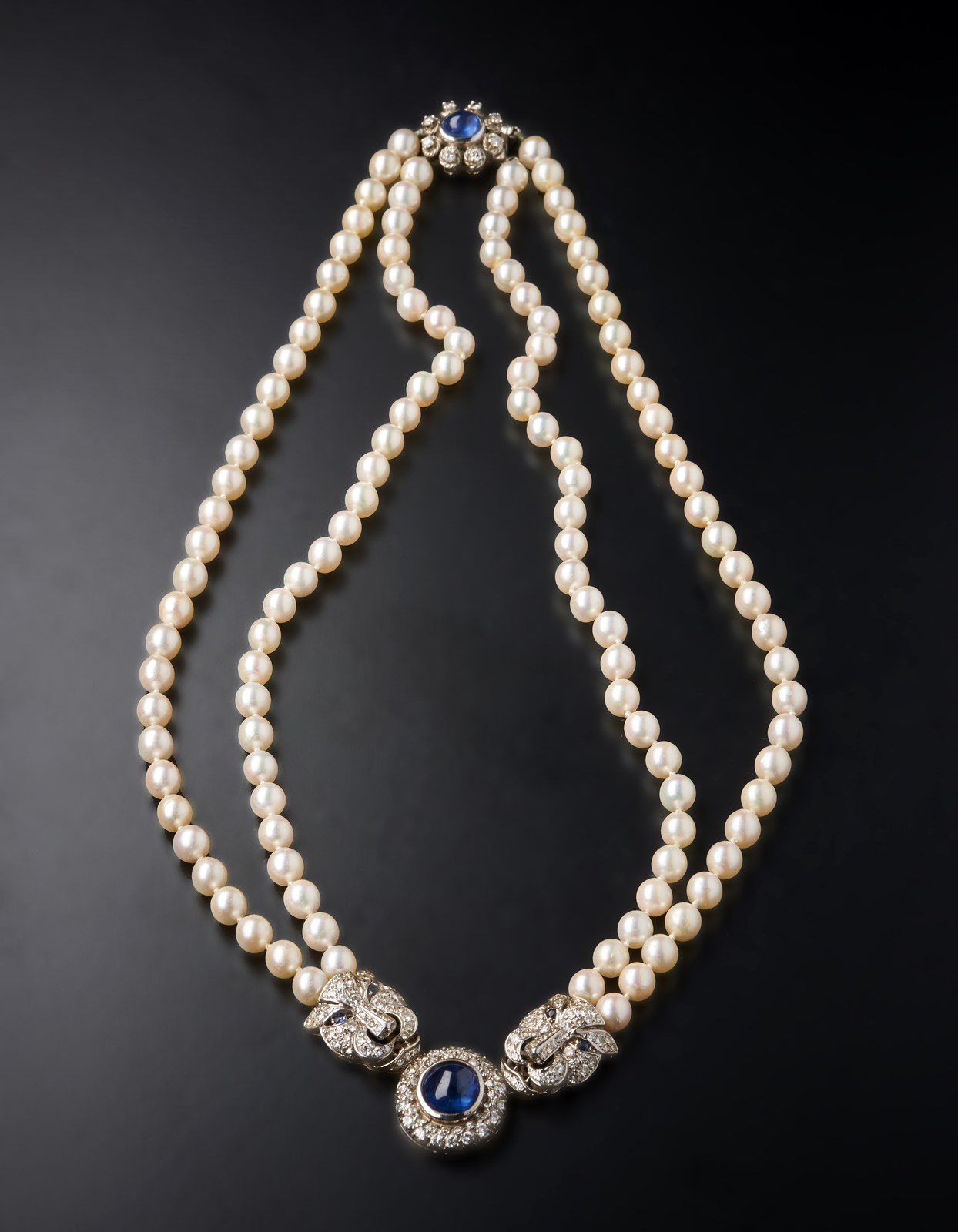 . Imponente collana a due fili di perle bianche sferiche di mm 7,00 con ciondolo centrale con zaffiro blu cabochon e diamanti taglio misto (huit huit ed a brillante) di circa 3,00 carati totali. . -. . Il ciondolo centrale reca al centro uno zaffiro blu cabochon di colore blu intenso. di ct. 5,00 circa Lo zaffiro è contronato da pavè di diamanti bianchi ed ai lati è sostenuto da due teste di leopardo con pavè di diamanti bianchi. Chiusura contrornata da diamanti bianchi e recante zaffiro blu ovale cabocon.