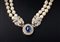 . - Imponente collana a due fili di perle bianche sferiche di mm 7,00 con ciondolo centrale con zaffiro blu cabochon e diamanti taglio misto (huit huit ed a brillante) di circa 3,00 carati totali. .