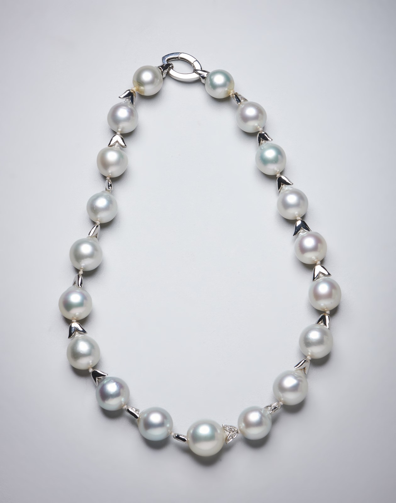 Collana di perle australiane sferiche di ottima coltivazione leggermente a scalare (da 14 mm a 17 mm) con inserti in oro bianco 750/1000 e diamanti bianchi taglio a brillante per 0,35 carati circa. . . Peso 26,15