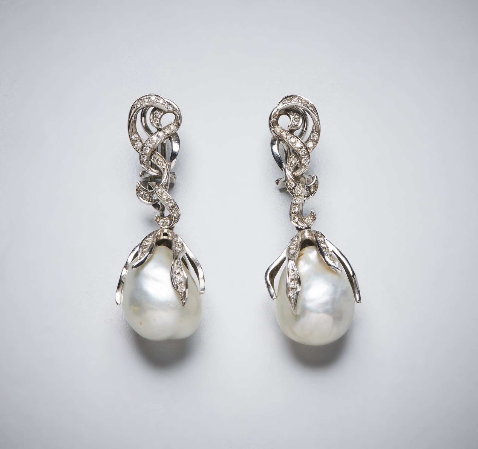 Coppia di orecchini in oro bianco 750/1000 con perle australiane (21x15 mm) e totale diamanti bianchi taglio a brillante 1,10 carati circa. . . Peso 16,80gr.