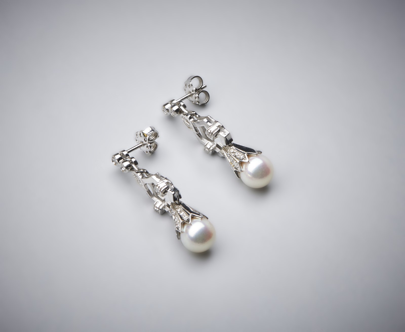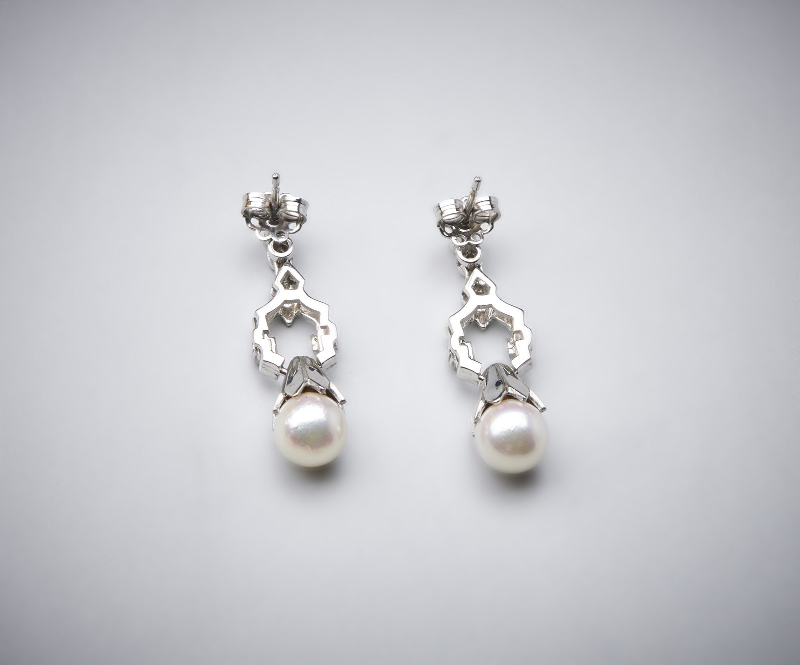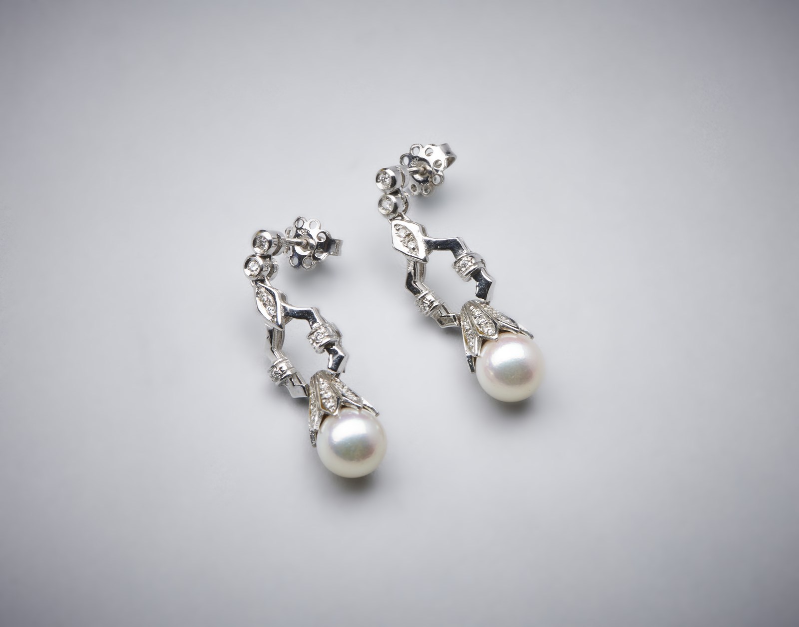 . Orecchini pendenti in oro bianco 750/1000 con coppia di perle sferiche bianche coltivate di mm 8,50 e piccoli diamanti bianchi di taglio misto di 0,80 ct circa. . . Peso lordo 9,52 gr.