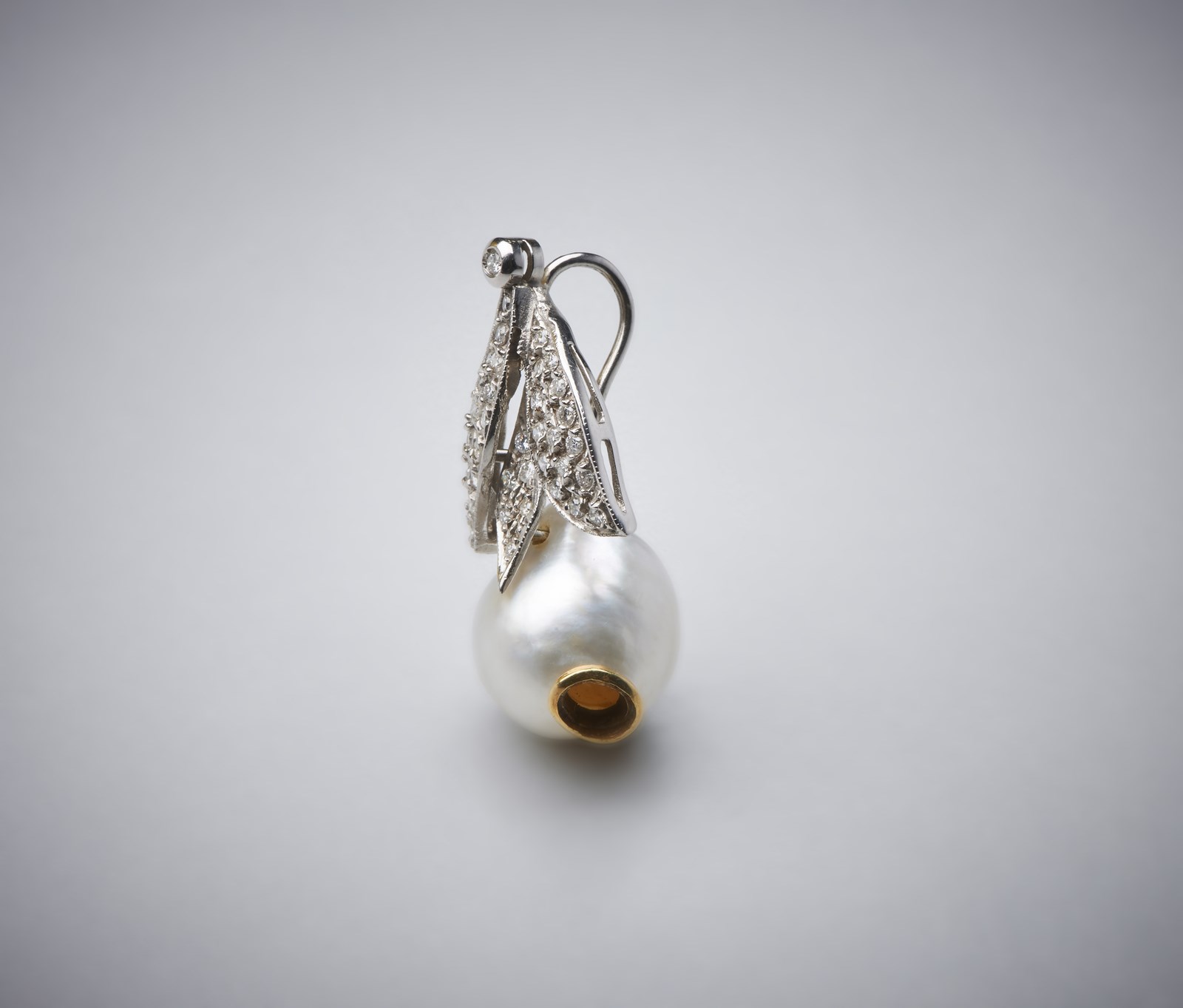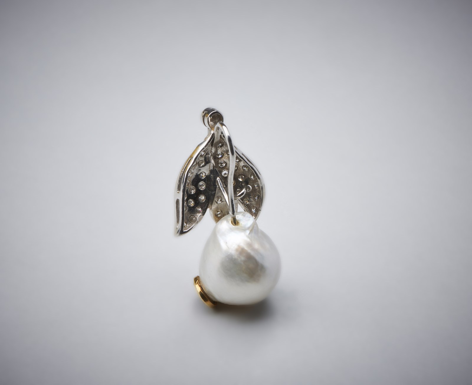 Lotto 56 | . - Ciondolo a forma di foglia con pavè di diamanti bianchi taglio a brillante di circa 1,50 ct in oro bianco 750/1000 e perla australiana coltivata di mm 15,00.