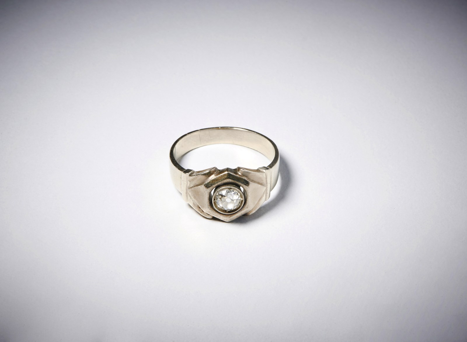 - Anello di forma geometrica anni 30" in argento con diamante centrale di taglio vecchio, ct. 0,60 .