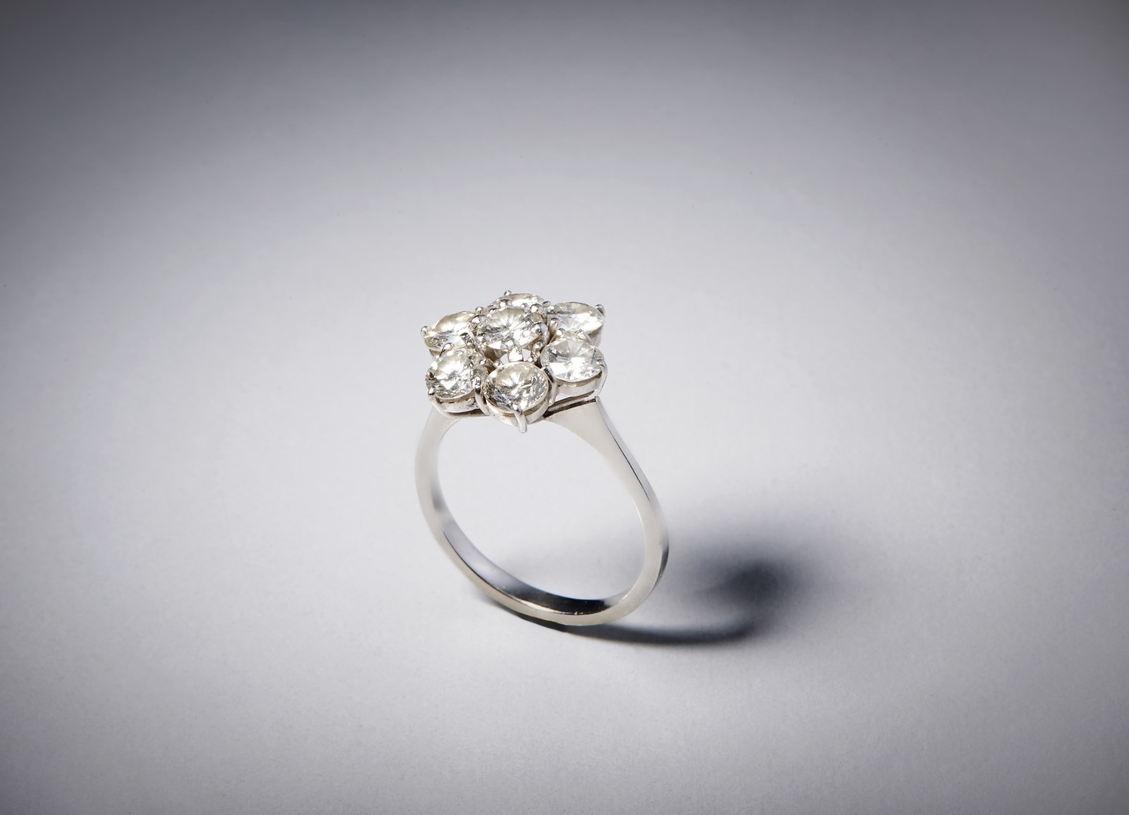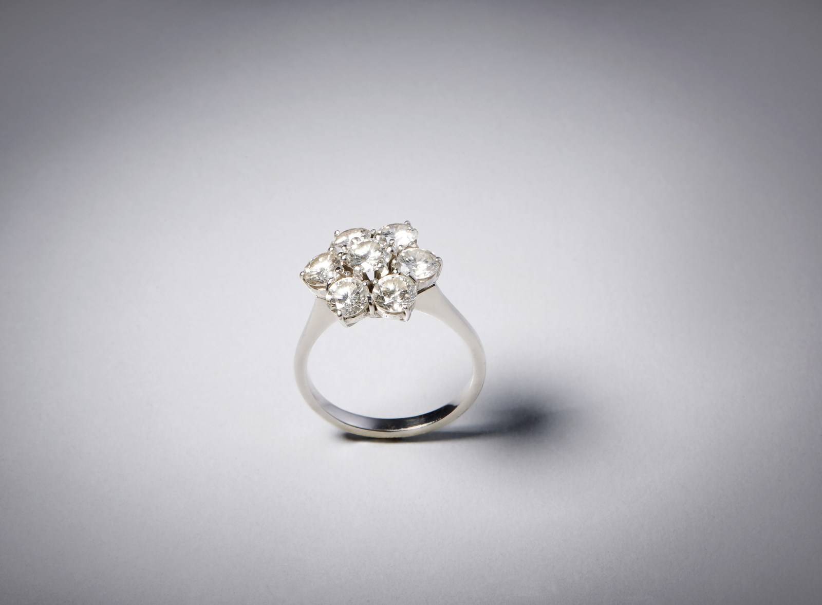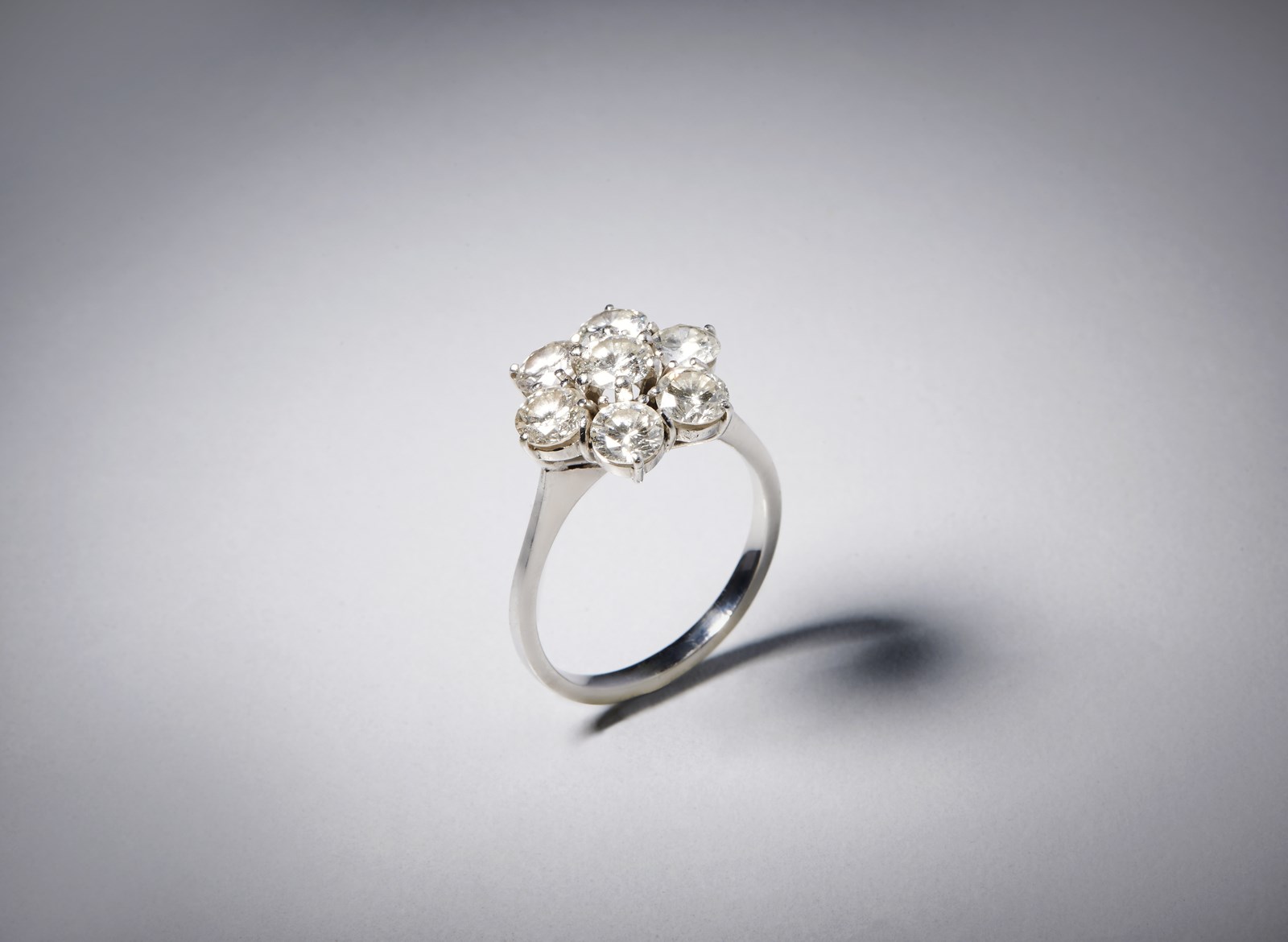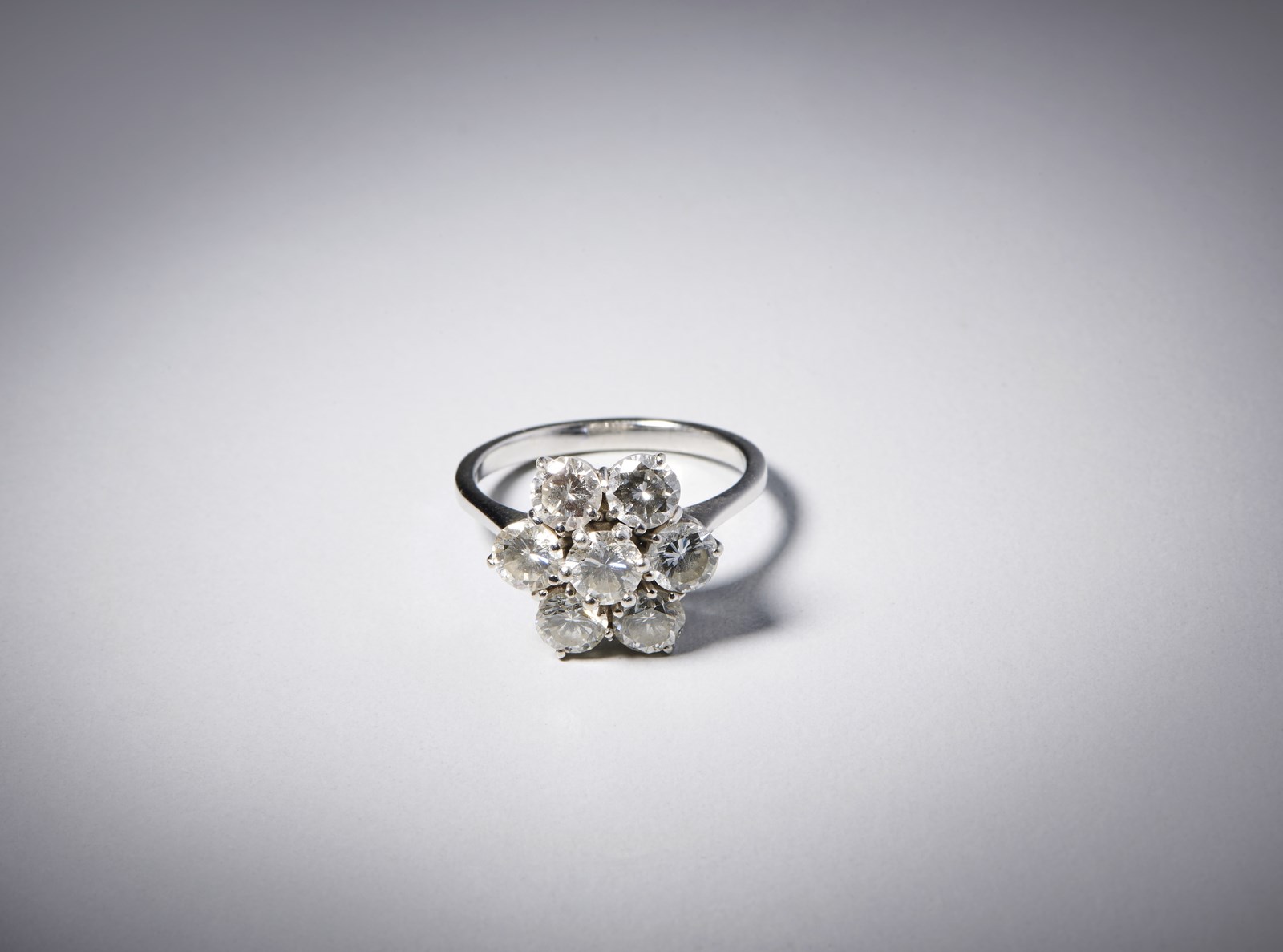 . Anello in oro bianco 750/1000 con disegno a fiore con diamanti bianchi taglio a brillante 2.30 ct. . . Colore stimato: G/H VVs/Vs