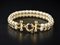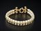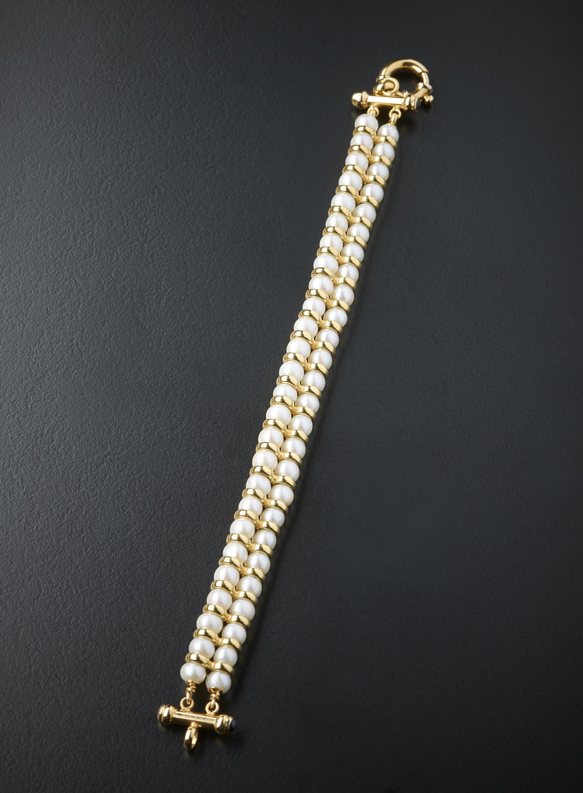 . - Bracciale di perle coltivate bianche 5.20 mm con struttura in oro giallo 750/1000 e piccoli zaffiri blu taglio cabochon.