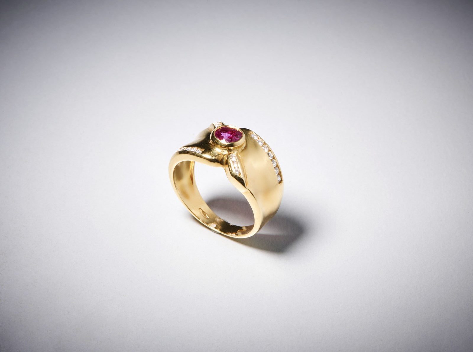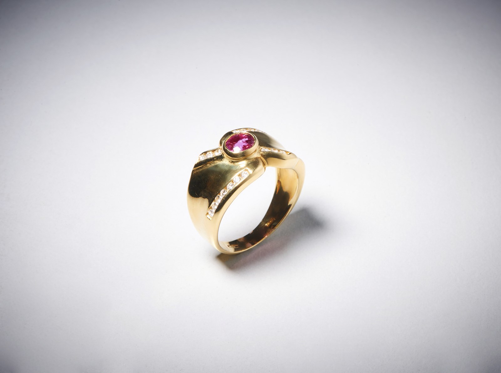. - Anello a "fascia" in oro giallo 750/1000 con rubino centrale ovale di circa 0,35 carati con contorno di diamanti bianchi taglio a brillante di circa 0,40 carati circa.