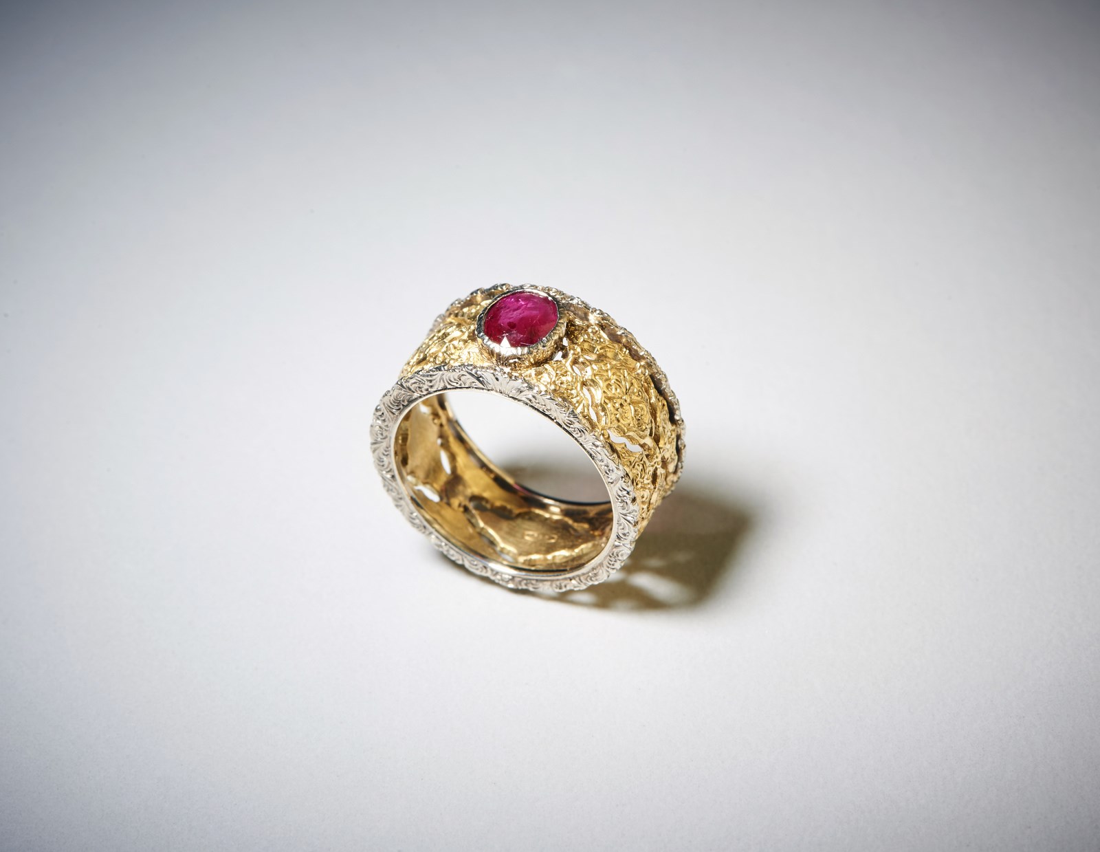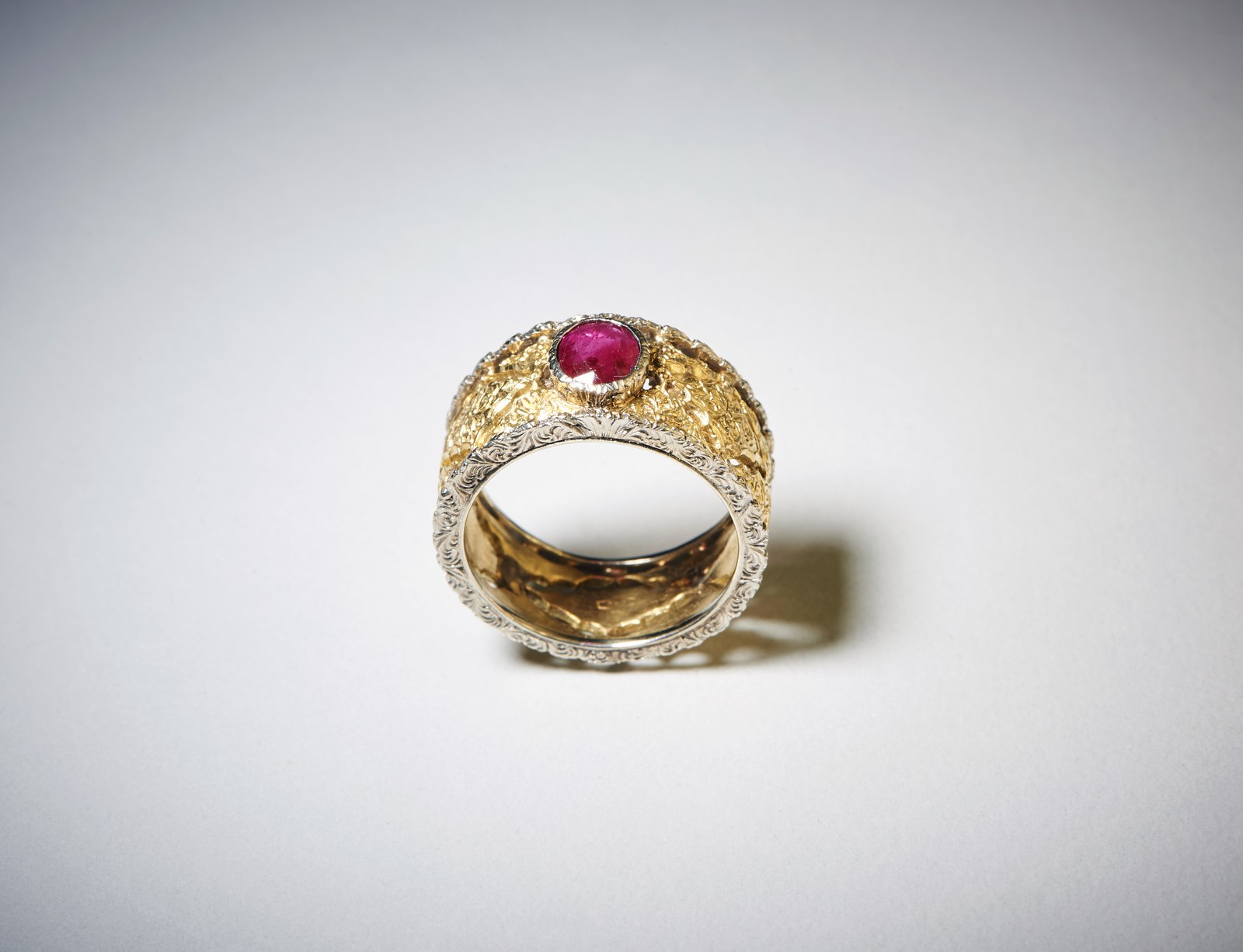 . Anello in oro bianco e giallo 750/1000 con lavorazione tipo filogranato con rubino centrale ct: 0,70. . . . Peso lordo: 7,43 gr.