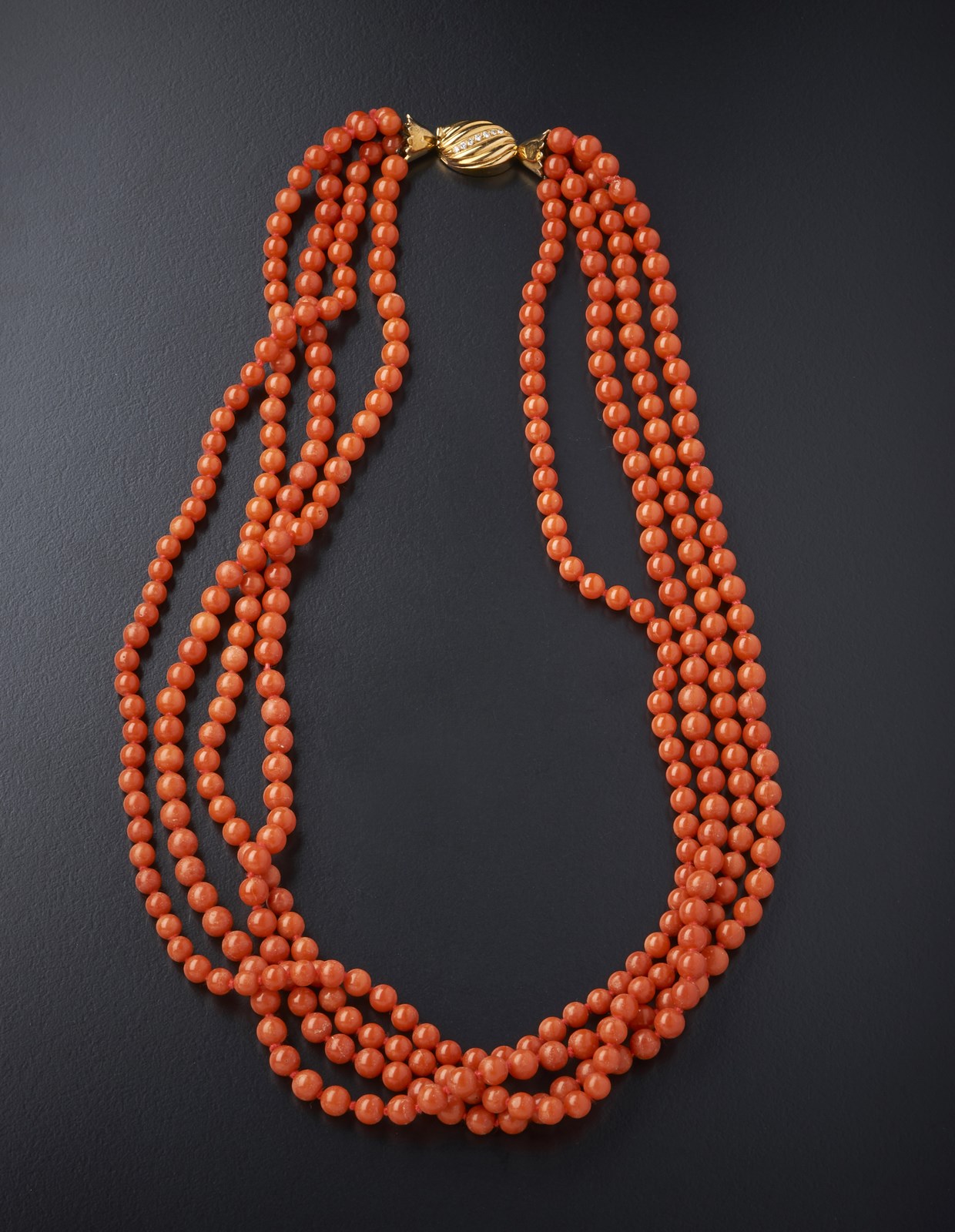 Lotto 85 | . - Torchon di quattro fili di i corallo rosso sferici con chiusura in oro giallo 750/1000 e piccoli diamanti bianchi.
