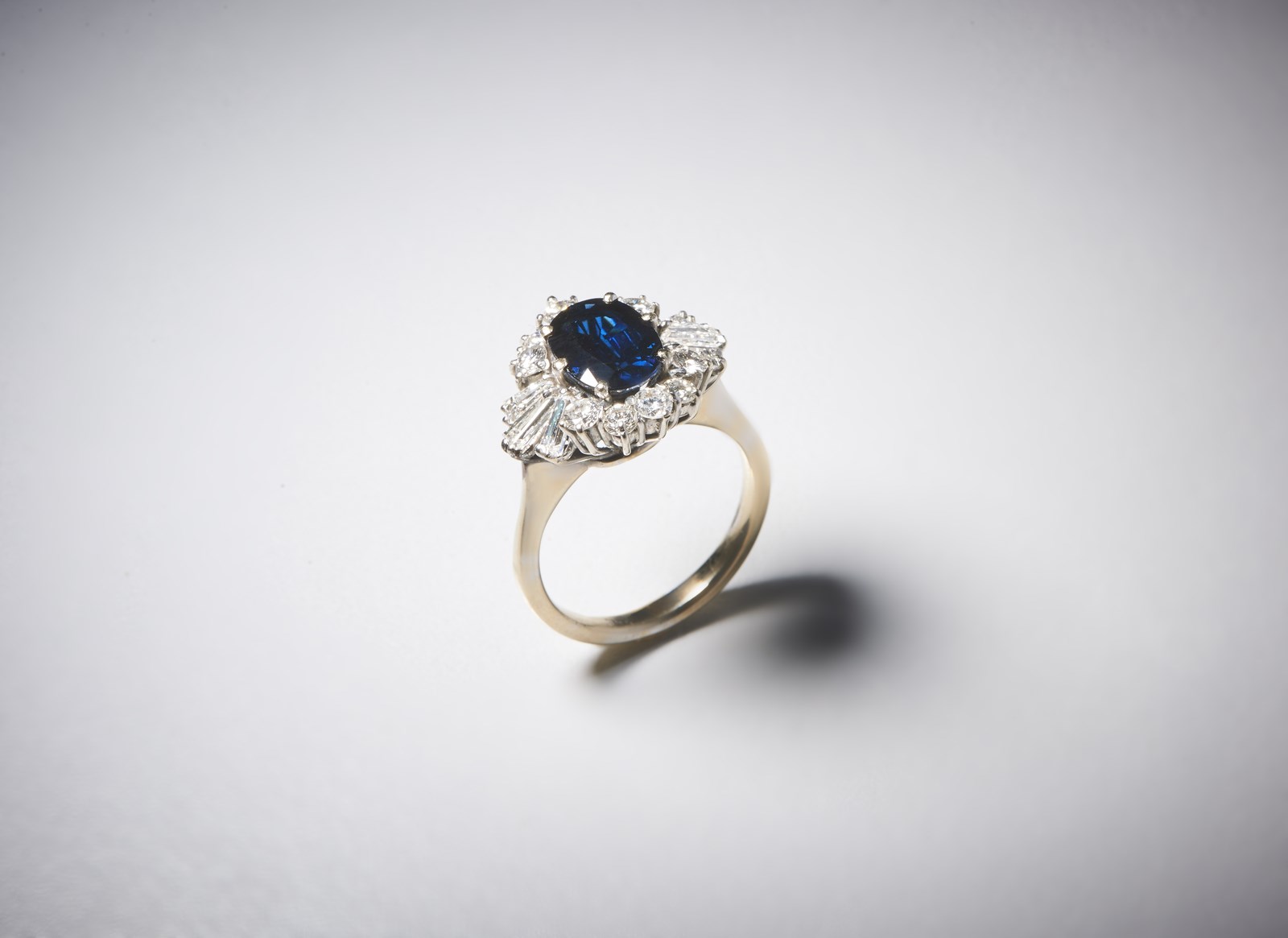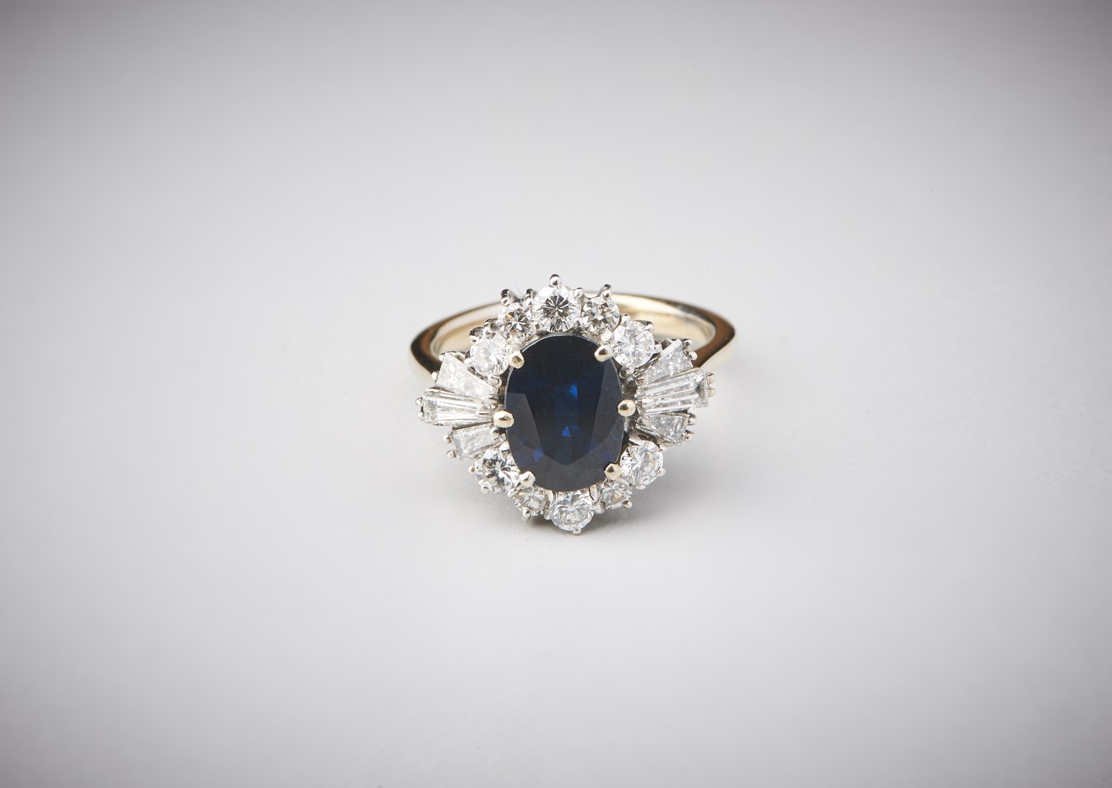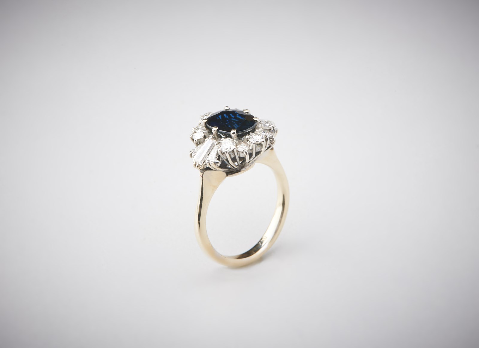 Lotto 97 | . - Anello oro bianco 750/1000 con zaffiro blu ct.2,20 circa e diamanti bianchi taglio misto ct. 1.10 circa. .