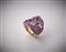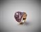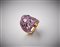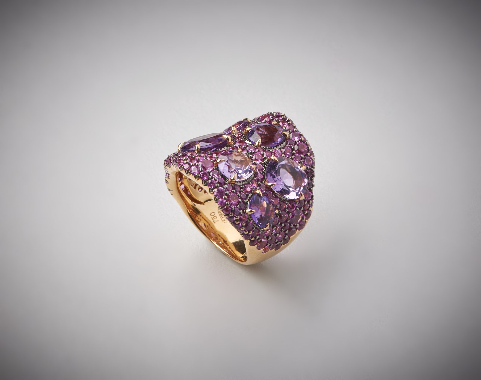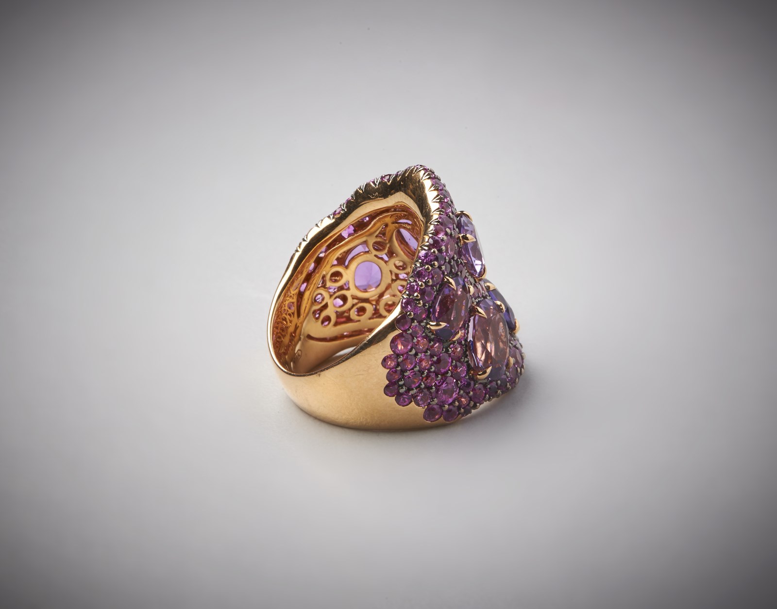 . - Anello artigianale in oro giallo 750/1000 con ametiste ovali e rodoliti incastonate in oro brunito taglio a brillante. .