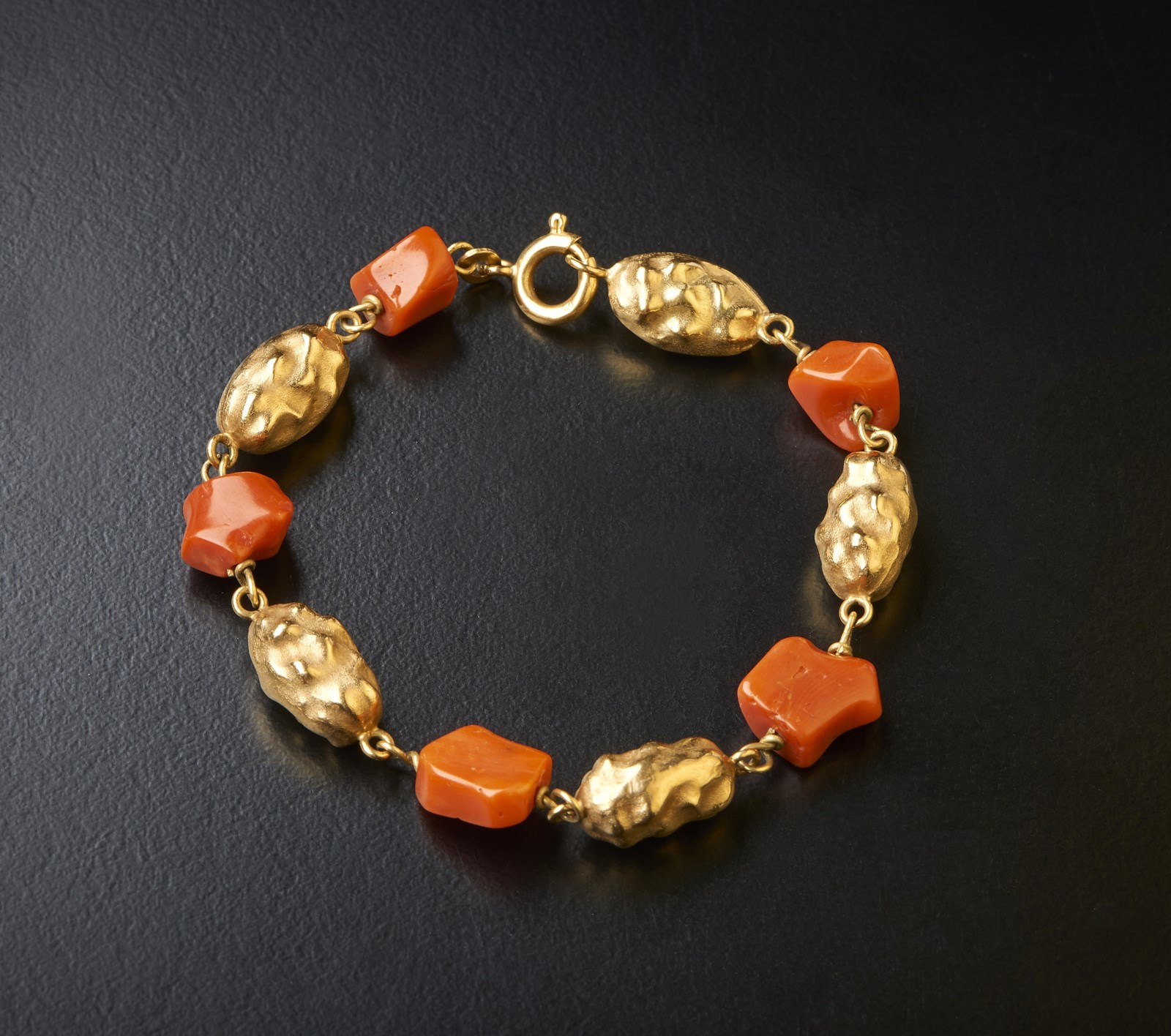 . Braccialetto oro giallo 750/1000 e corallo con lavorazione particolare, tipo a pepite. . . . Peso gr. 12,43